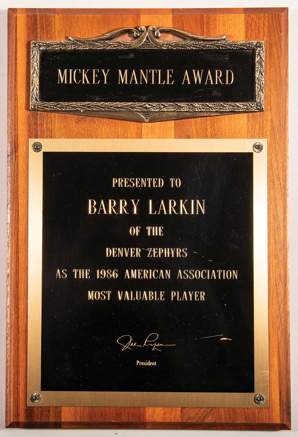 Description:Barry Larkin's American Association 1986 Most Valuable Player award (EX). Mickey Mantle Award presented to Larkin in honor of his selection as the American Association MVP in 1986. Walnut wooden plaque displays engraved metal placards affixed to the front, with titling presented to Larkin, and "Mickey Mantle Award" at top. Measures approx. 10"x15", with some light surface scratches. Includes a previous auction's letter of provenance signed by Barry Larkin: EX