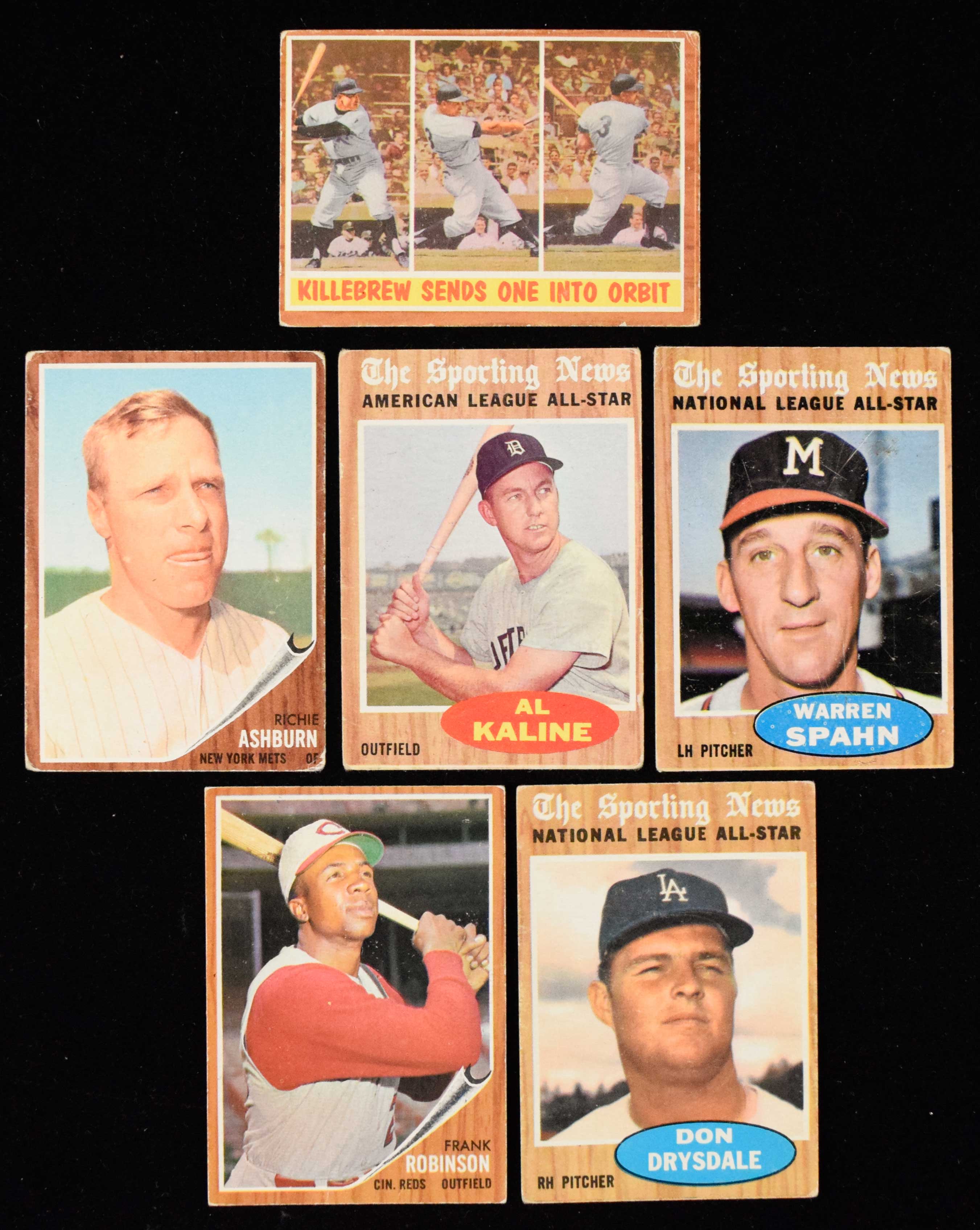 Description:1962 Topps Baseball 380-card partial set (FR/GD-EX). Highlights include #s 29 Casey Stengel, 52 NL Batting Leaders, 167 McCarver rookie, 213 Richie Ashburn, 243 Robin Roberts, 316 Harmin Killebrew, 325 Luis Aparicio, 350 Frank Robinson, 385 Early Wynn, 398 Don Drysdale, 399 Warren Spahn, 470 Al Kaline, 468 Brooks Robinson, 505 Juan Marichal. Remainder are mostly commons, with some minor and regional stars mixed in. Various conditions throughout the lot. Most appear to average VG overall. Range: FR/GD-EX