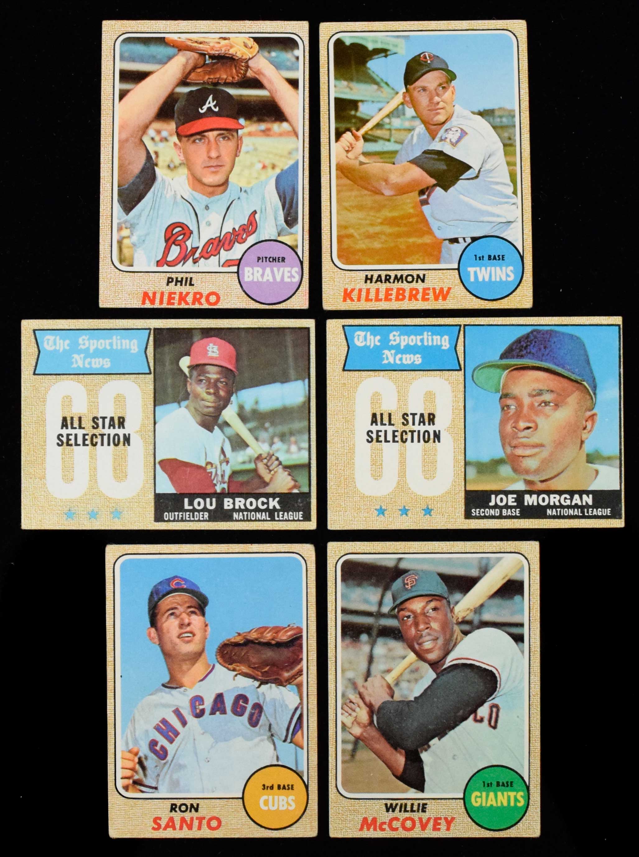 Description:1968 Topps Baseball 318-card partial set (PR/FR-VG/EX). Highlights include #s 145 Don Drysdale (ink mark on back), 220 Harmon Killebrew, 225 Allen, 235 Ron Santo, 257 Phil Niekro, 290 Willie McCovey, 310 Luis Aparicio, 364 Joe Morgan, 372 Lou Brock, 385 Hunter, 390 Bill Mazeroski. Remainder are mostly commons, with some minor and regional stars mixed in. Various conditions throughout the lot. Most appear to average G/VG overall. Range: PR/FR-VG/EX