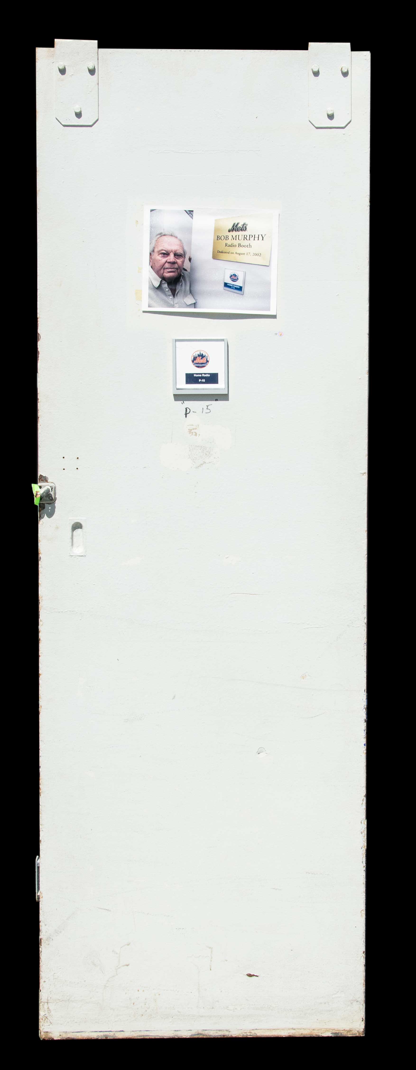 Description:Shea Stadium Radio Broadcast Booth Door - the room where all Mets Radio Broadcasting took place at Shea Stadium (EX) Original door as long used in Shea Stadium for the room from which long time announcer Bob Murphy would call games. Done in metal measuring approx. 81"x27" it would slide open and closed via wheels along the upper edge. Wear evident throughout as expected given long term use as intended. The Mets logo "Home Radio" placard remains on front however an additional above has since been removed (there is currently an image of Murphy standing beside the door affixed in its' place. MLB Authentication hologram affixed (SH073272). Please note: the door is substantive/heavy and will require freight shipping: EX ($1,000-$2,000)