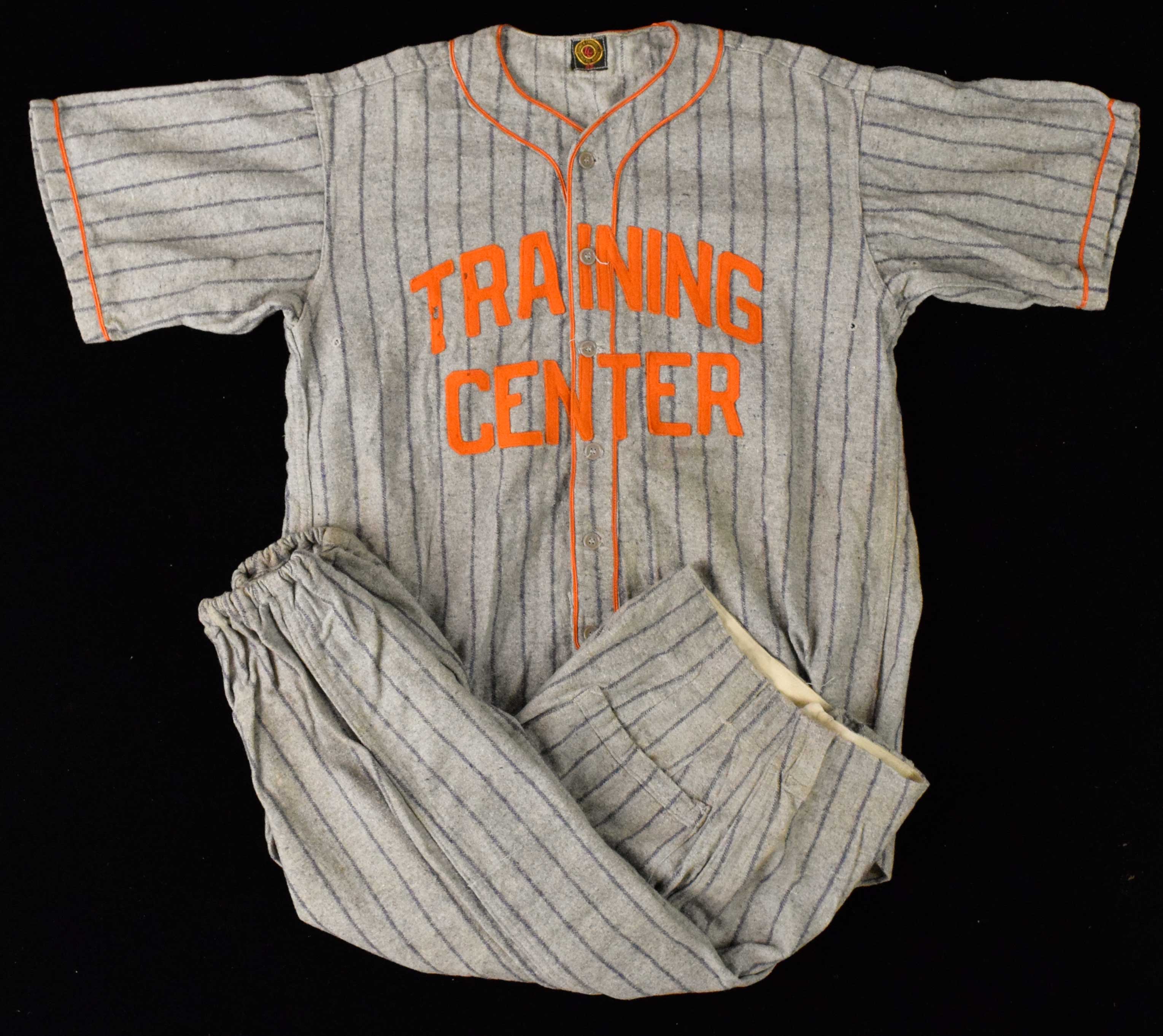 Description:Lowe & Campbell vintage baseball uniform, c.1930s-40s (EX/MT). Lowe & Campbell Athletics Goods size 42 "TRAINING CENTER" jersey (possibly a military team), with matching Lowe & Campbell size 36 pants. Small spots of felt loss to some of the letters: EX/MT