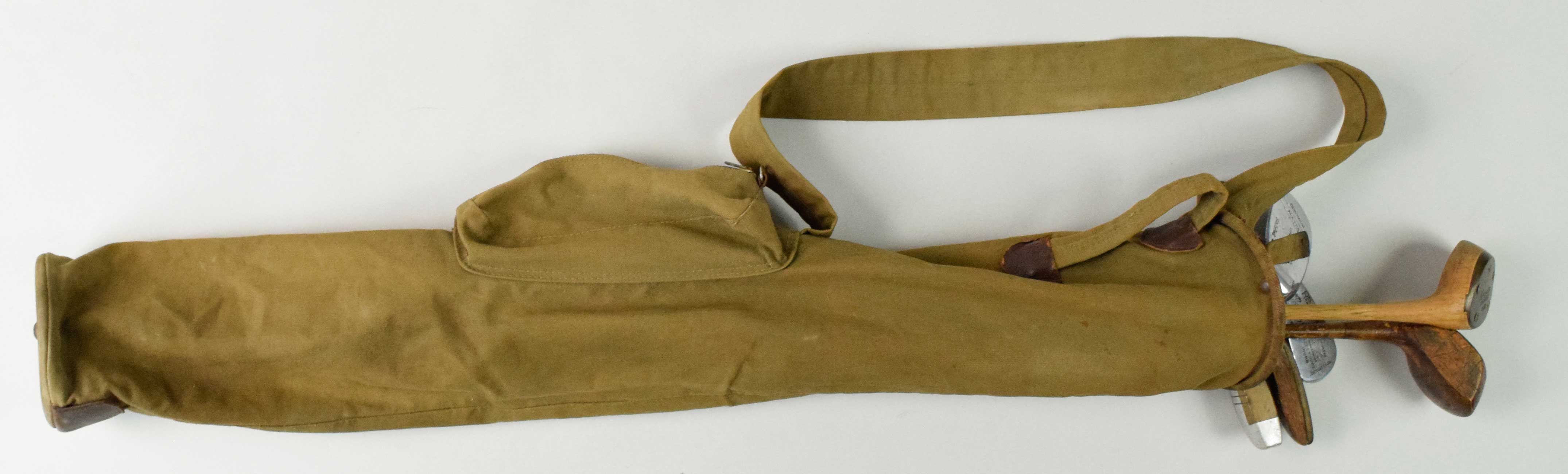 Description:Lot of (7) vintage golf clubs with bag, c.1910s-50s (VG/EX-EX/MT). Includes c.1910s-20s Kroydon 2122 model wood shaft Driver with "D.E. Miner" name on the head, c.1910s-20s Kroydon wood shaft Brassie with "D.E. Miner" name on the head, c.1920s-30s Spalding wood shaft 5-iron, c.1920s-30s Leacock wood shaft 8-niblick, c.1920s-30s Beckley Ralston putter with steel shaft and square wood handle, c.1930s Rosasco Bros. Uniwood R-70 wood shaft putter, c.1940s Burton PGC model 12 wood shaft putter, c.1950s Otey Crisman wood shaft putter, and c.1940s-50s canvas golf club bag. Most appear to average EX overall with normal use/age wear. Range: VG/EX-EX/MT