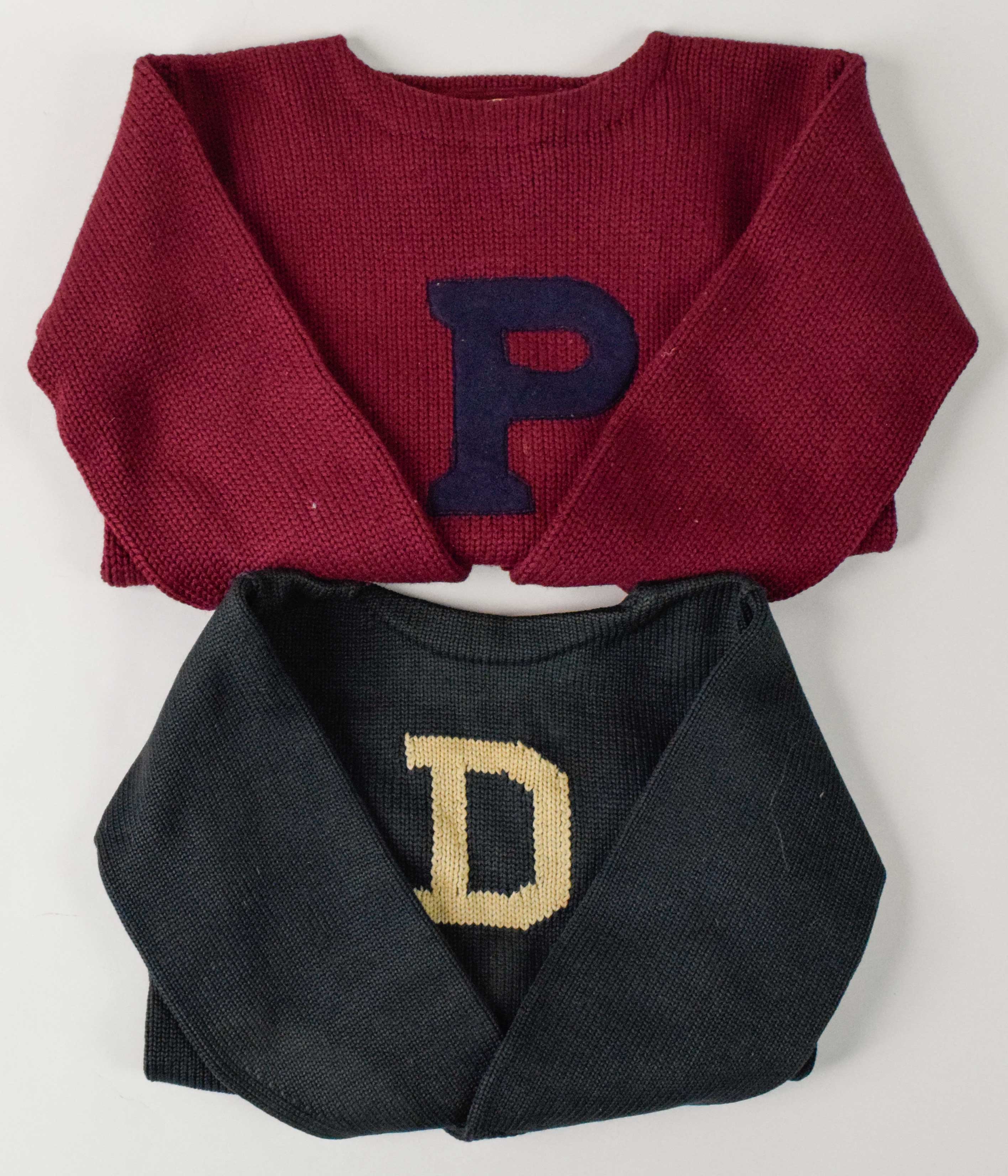 Description:Lot of (4) vintage letterman sweaters, c.1930s-60s (VG/EX-NM). Includes c.1930s-40s "C" sweater by Wormhoudt & Kempkes (tag wear), c.1930s-40s "H" sweater by McCarthy-Morris Co. (possibly Harvard based on the color scheme), c.1940s-50s untagged "D" sweater, and c.1950s-60s "P" sweater by Pearson Sporting Goods (possibly Penn based on the color scheme): VG/EX-NM
