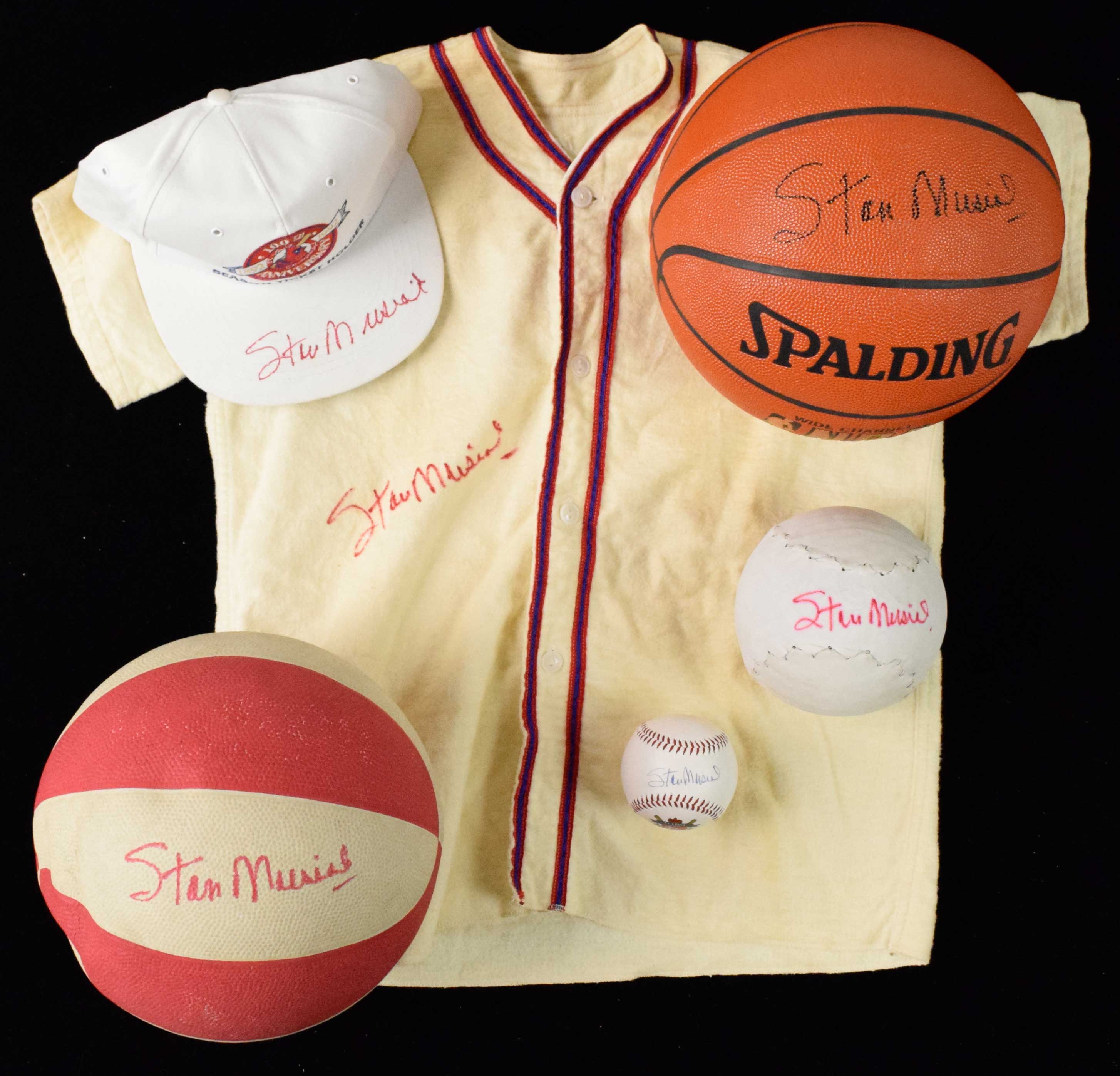 Description:Interesting lot of (9) Stan Musial signed items (VG-NM/MT). Includes c.1950s youth baseball jersey and pants both signed by Musial in red marker, 1974 St. Louis Cardinals radio signed by Musial in black marker, Cardinals logo baseball signed by Musial in blue ink, Longton Crown 8" Stan Musial stein signed by Musial in blue marker, 1992 Cardinals season ticket holder hat signed by Musial in red marker, deBeer softball signed by Musial in red marker, Spalding NBA indoor/outdoor basketball signed by Musial in black marker, and a used red & white basketball signed by Musial in red marker. Signatures rate 6/7 (radio) to 10 (avg 8) out of 10: VG-NM/MT