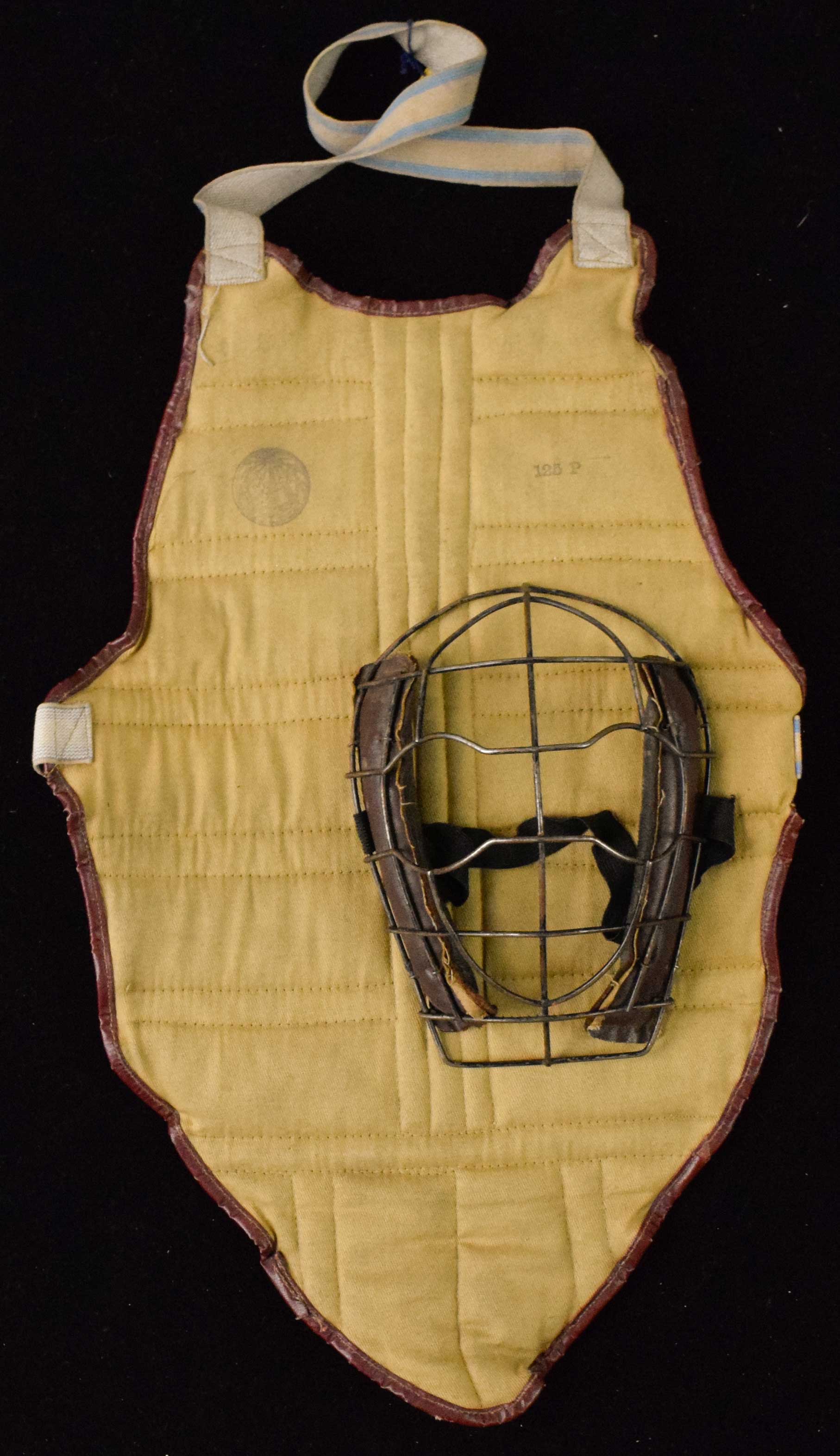 Description:Vintage youth catcher's mask and chest protector, c.1900s-30s (EX-NM). Includes c.1900s-10s youth catcher's mask (EX-EX/MT), and c.1920s-30s chest protector with Zenith Marshall-Wells Hardware Co. tag still attached (NM unused).