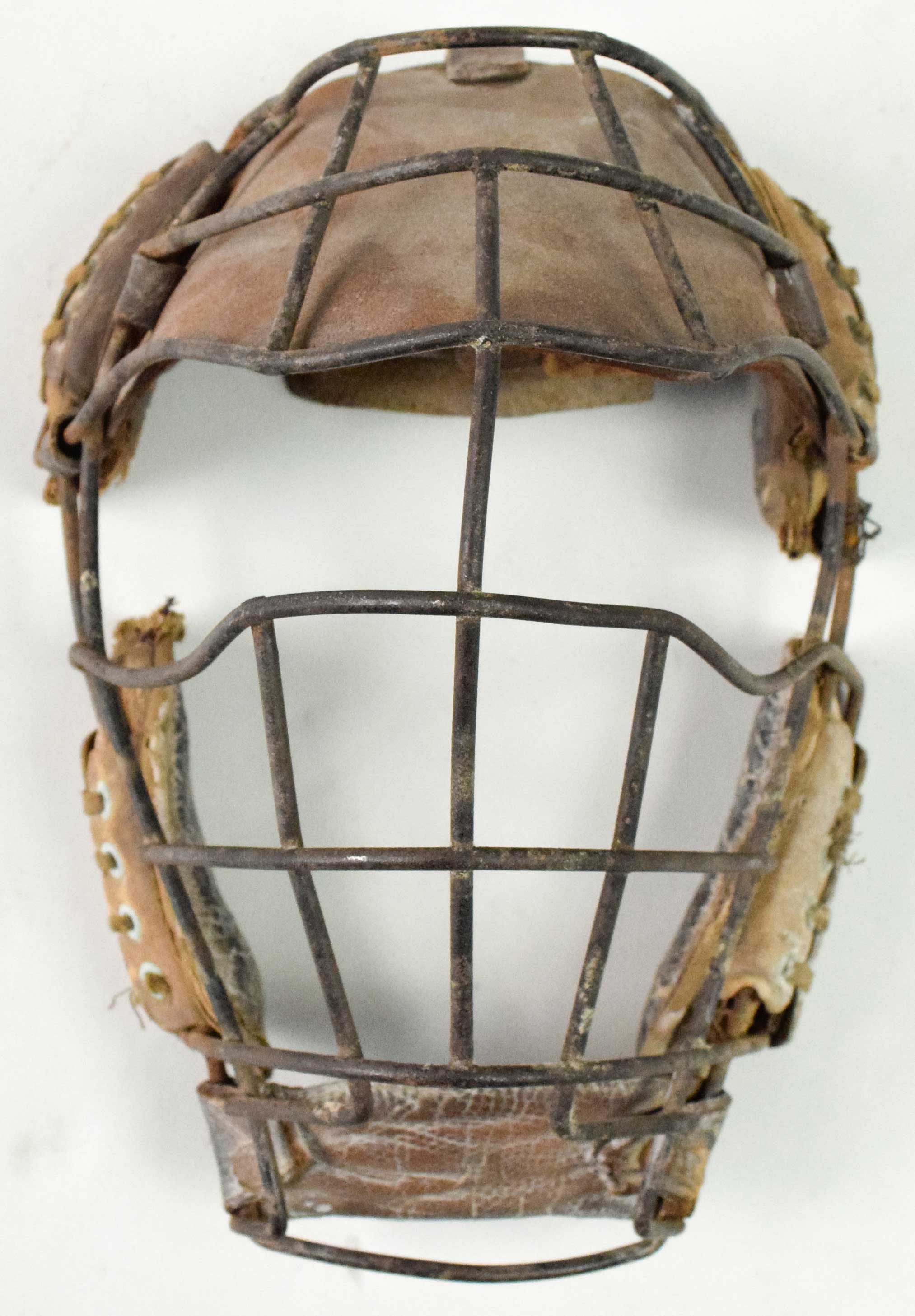 Description:Vintage sun visor catcher's mask, c.early 1900s (VG). Heavy steel wire mask with sun visor above the eyes, and leather chin guard. Padding is still intact, but shows fairly heavy use, and is missing its straps: VG