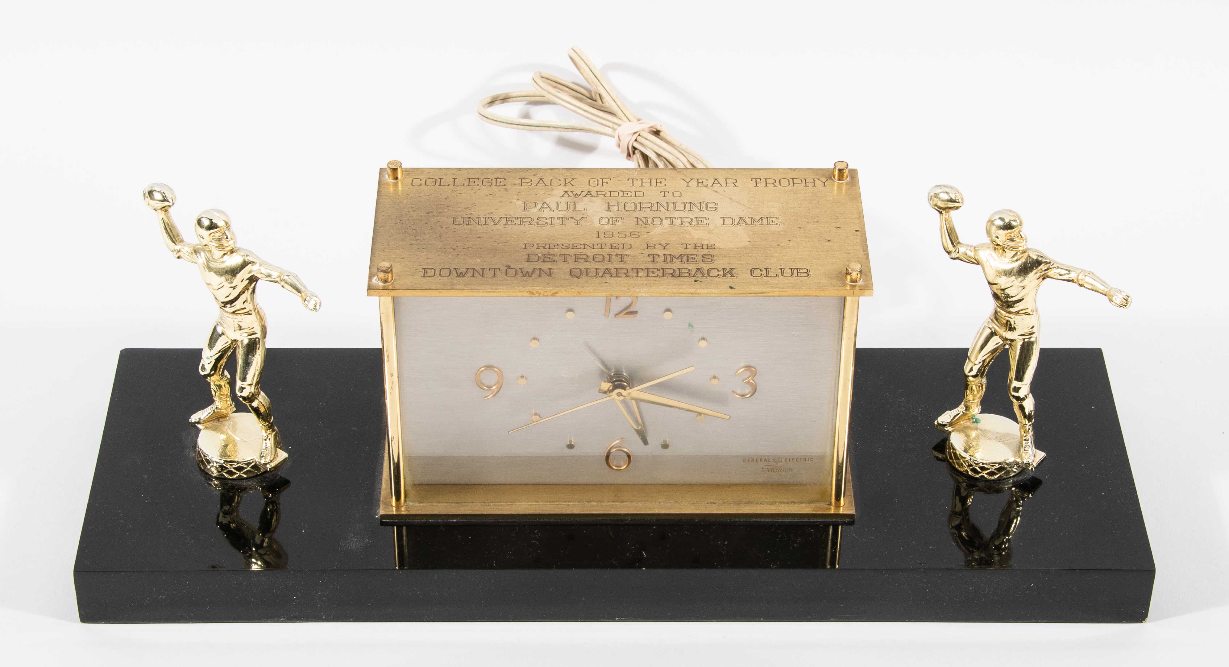 Description:1956 Paul Hornung College Back of the Year presentational award (Hornung Family letter of provenance) (EX) Handsome figural desk clock as presented to Hornung in recognition of his selection as College Back of the Year by the Detroit Times Downtown Quarterback Club. Brass cased electric clock is engraved with titling on top having two cast figural football players flanking the clock atop a black marble base. 15" long with light to moderate wear. Clock appears to be in running order with original electric wiring intact. Includes letter of provenance from Angela Hornung: EX ($400-$600)