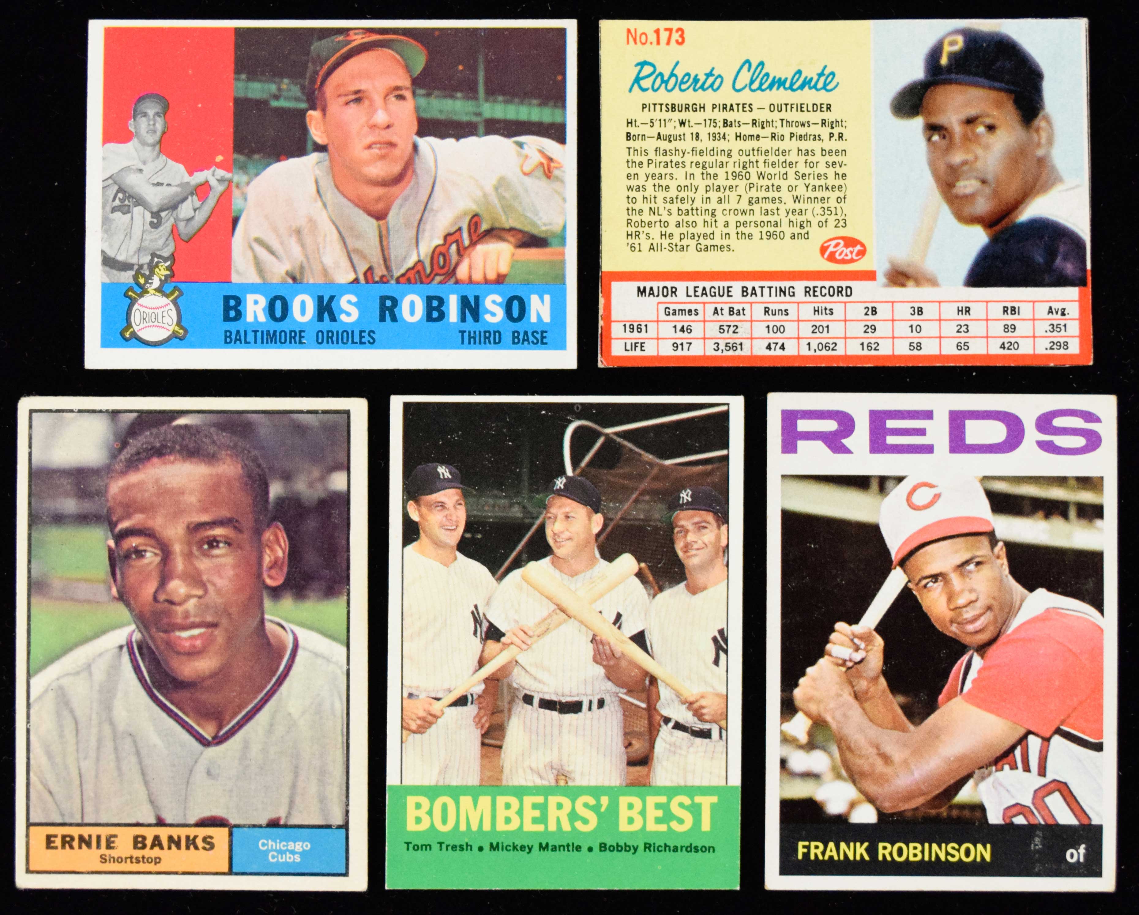Lot of (42) HOFers baseball cards from 1960-1978 (VG-EX/MT). Includes 1960 Topps #28 Brooks Robinson; 1961 Topps #s 10 Robinson, and 350 Ernie Banks; 1962 Topps #45 Robinson; 1962 Post Cereal #173 Roberto Clemente; 1963 Topps #s 173 Bombers Best with Mantle, and 345 Robinson; 1963 Fleer #4 Robinson; 1964 Topps #s 230 Brooks Robinson, and 260 Frank Robinson; 1965 Topps #s 120 Frank Robinson, and 150 Brooks Robinson; 1966 Topps #s 310 Frank Robinson, and 390 Brooks Robinson; 1967 Topps #100 Robinson; 1968 Topps #s 20 Brooks Robinson, 365 Brooks Robinson, 373 Frank Robinson, and 500 Frank Robinson; 1968 Topps Game #s 7 Frank Robinson, and 9 Brooks Robinson; 1969 Topps #s 421 Robinson, and 550 Robinson; 1969 Topps Deckle Edge #1 Robinson; 1970 Topps #s 230 Robinson, 453 Rod Carew, (2) 455 Robinson, 462 Hank Aaron, 463 Robinson, 464 Johnny Bench, and 700 Robinson; 1970 Kellogg's #21 Robinson; 1971 Topps #300 Robinson; 1972 Topps #100 Robinson; 1973 Topps #90 Robinson; 1974 Topps #160 Robinson; 1975 Topps #50 Robinson; 1976 Topps #s 95 Robinson, and 345 Babe Ruth; 1977 Topps #285 Robinson; 1978 Topps #4 Robinson. Various conditions throughout the lot. Most appear to average VG/EX overall. Range: VG-EX/MT