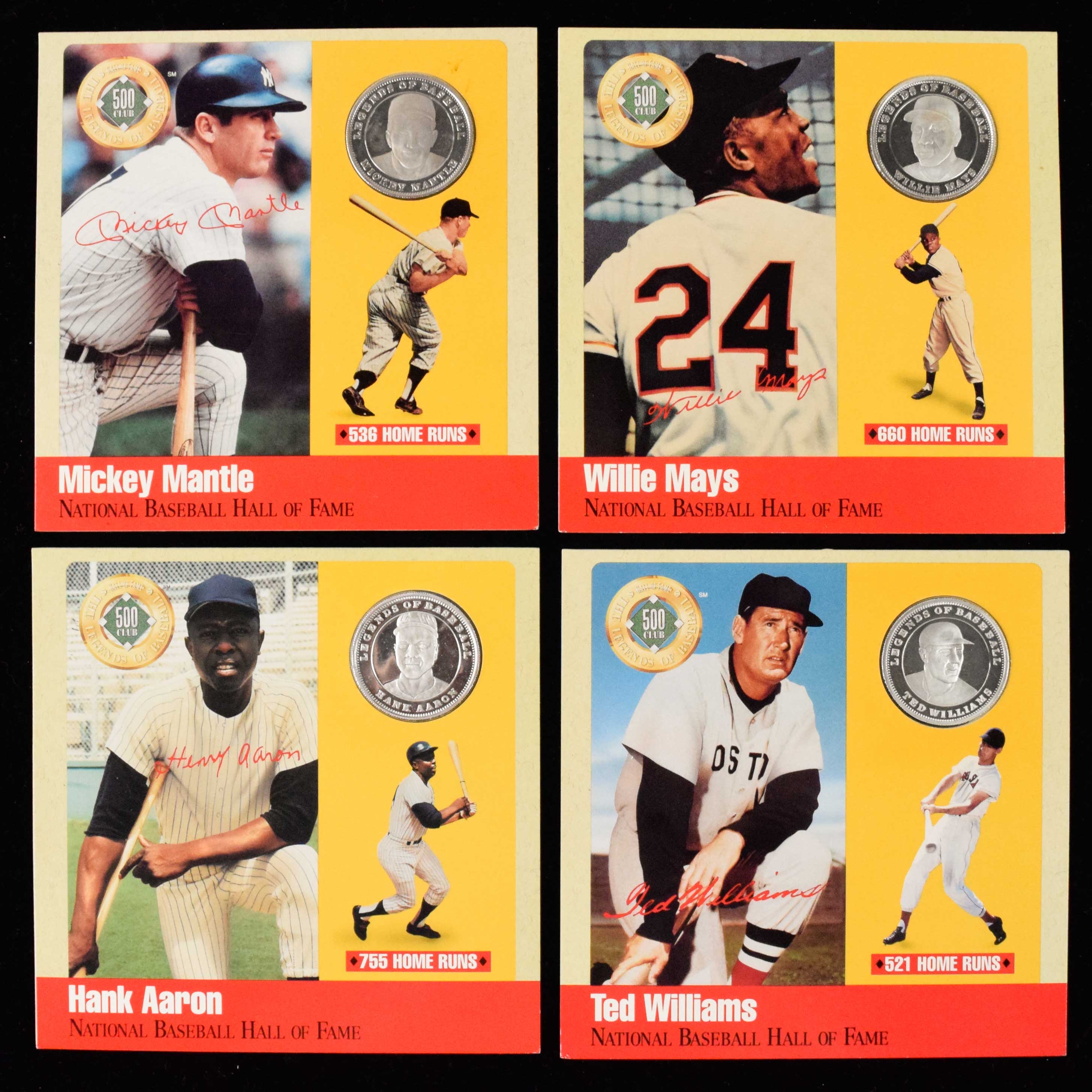 Description:Set of (12) 500 HR Club silver proof coins (NM-NM/MT). Produced in 1990, and still within their original cardboard packaging. Includes Hank Aaron, Babe Ruth, Willie Mays, Harmon Killebrew, Frank Robinson, Mickey Mantle, Jimmie Foxx, Ted Williams, Willie McCovey, Eddie Mathews, Ernie Banks, and Mel Ott. Each coin weight 20-grams, for a total of 240-grams in the lot (nearly 8.5-oz.): NM-NM/MT overall