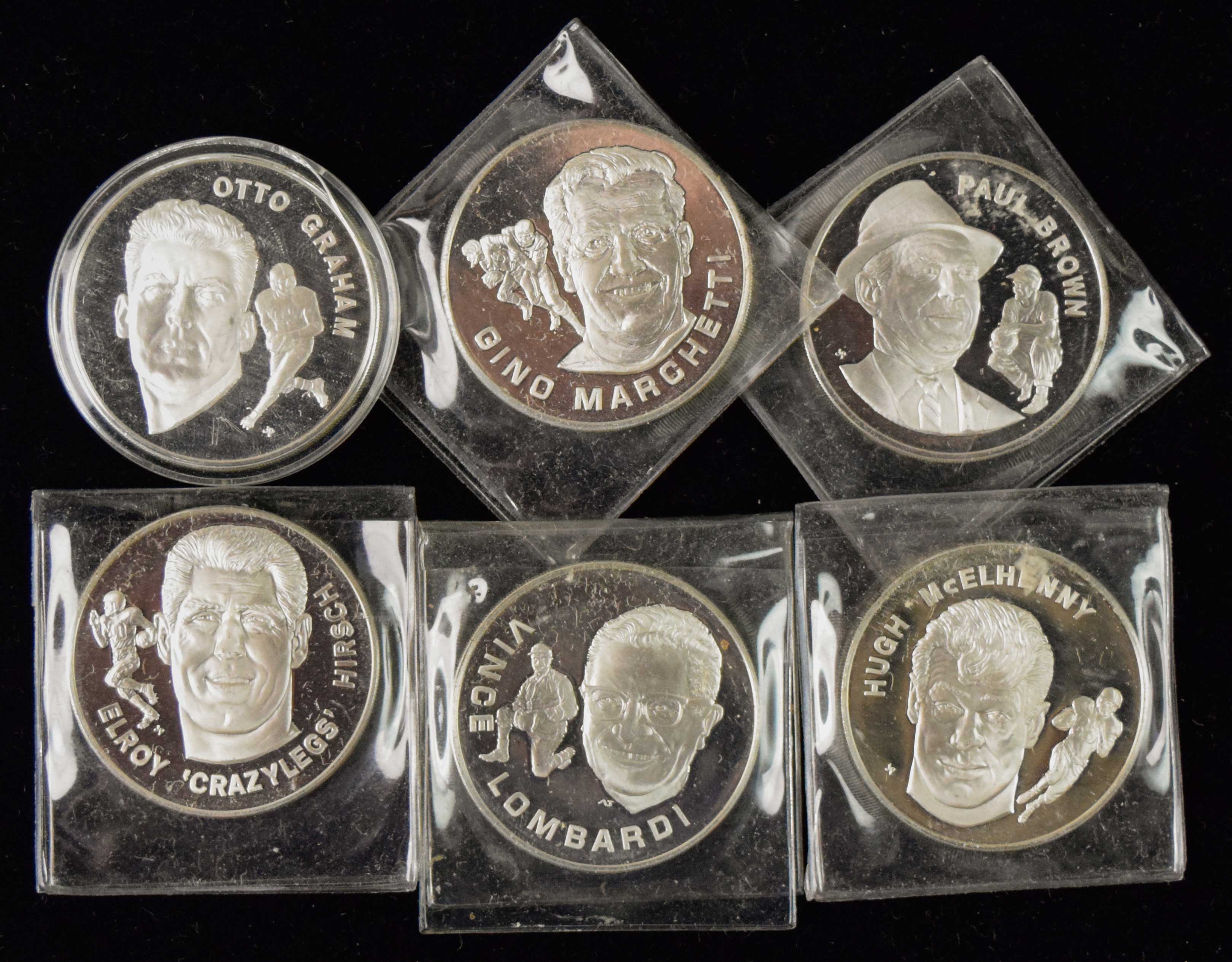 Description:Lot of (9) 1972 Franklin Mint "Footballs Immortals" silver coins (NM-NM/MT). Includes Paul Brown, Otto Graham, Crazylegs Hirsch, Bobby Layne, Vince Lombardi, Gino Marchetti, Hugh McElhenny, Charley Trippi, and Norm Van Brocklin. All are marked Sterling. Coins weigh just over 1-oz., for a total of slightly over 9-oz. in the lot: NM-NM/MT