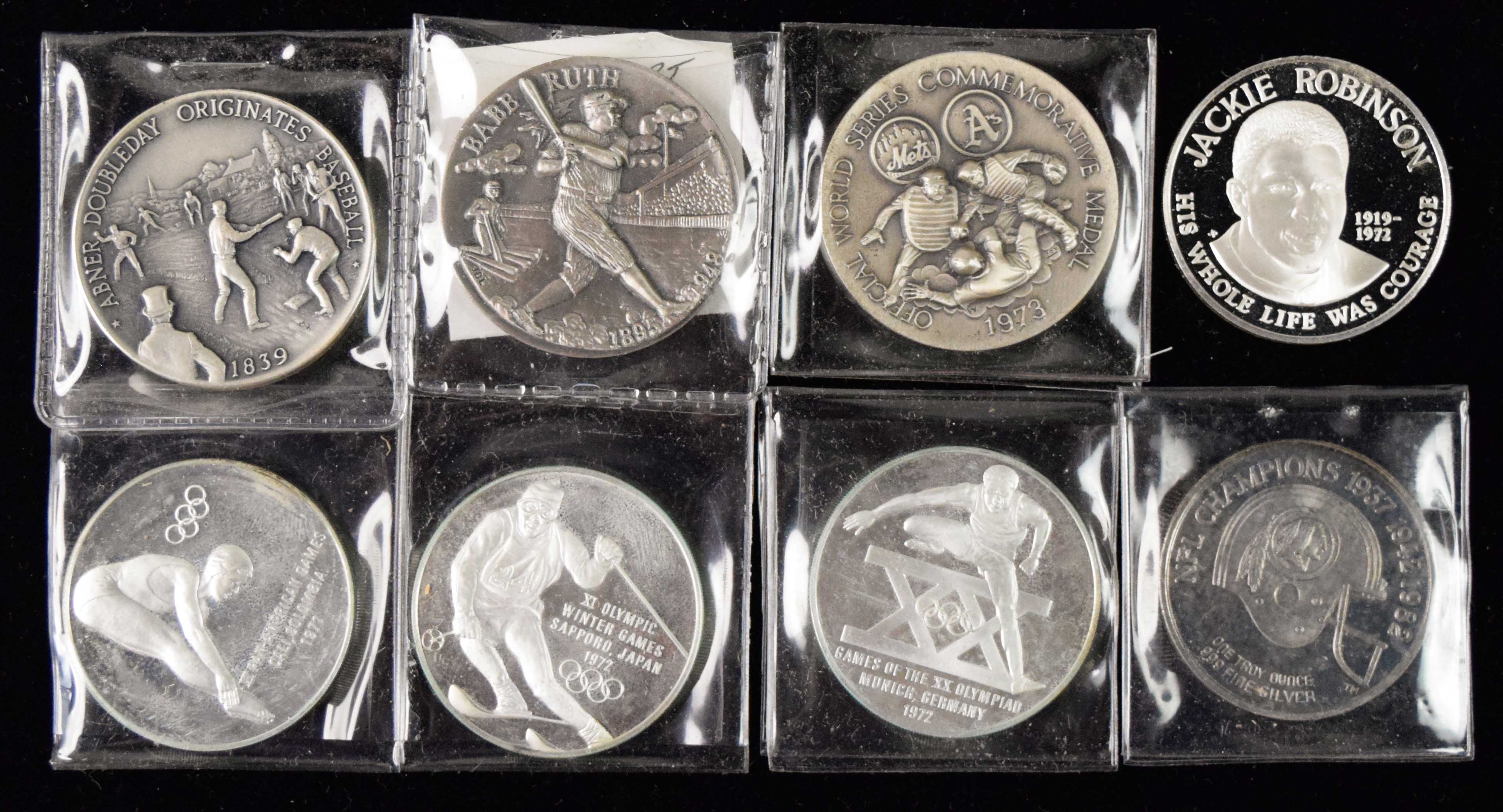 Description:Lot of (13) silver sports coins (NM overall). Includes Abner Doubleday, Babe Ruth, Jackie Robinson, 1973 World Series, 1971 Pan-Am Games, 1979 Pan-Am Games, 1986 Washington Redskins 50th season, Jim Mora, 1889 John L. Sullivan vs Jake Kilrain, (2) different 1972 Olympics, Brigham Young University, and Norman Rockwell fishing image. Coins weigh a total of approx. 13.5-oz.: NM overall