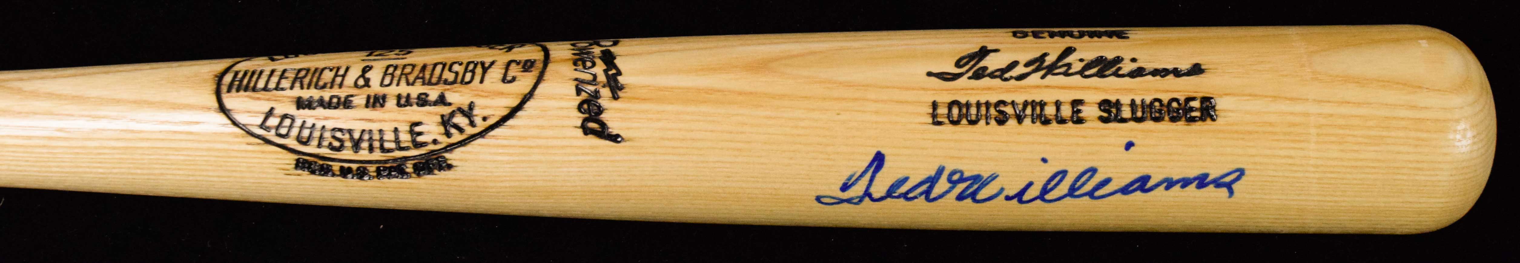 Description:Ted Williams autographed baseball bat (EX/MT-NM) Louisville Slugger bat done in similar style to that which he would have used has been signed "Ted Williams." Marker signature rates 8/9 out of 10. Hint of light surface wear is noted for accuracy but does not have all to much effect when the bat is displayed: EX/MT-NM ($400-$600)