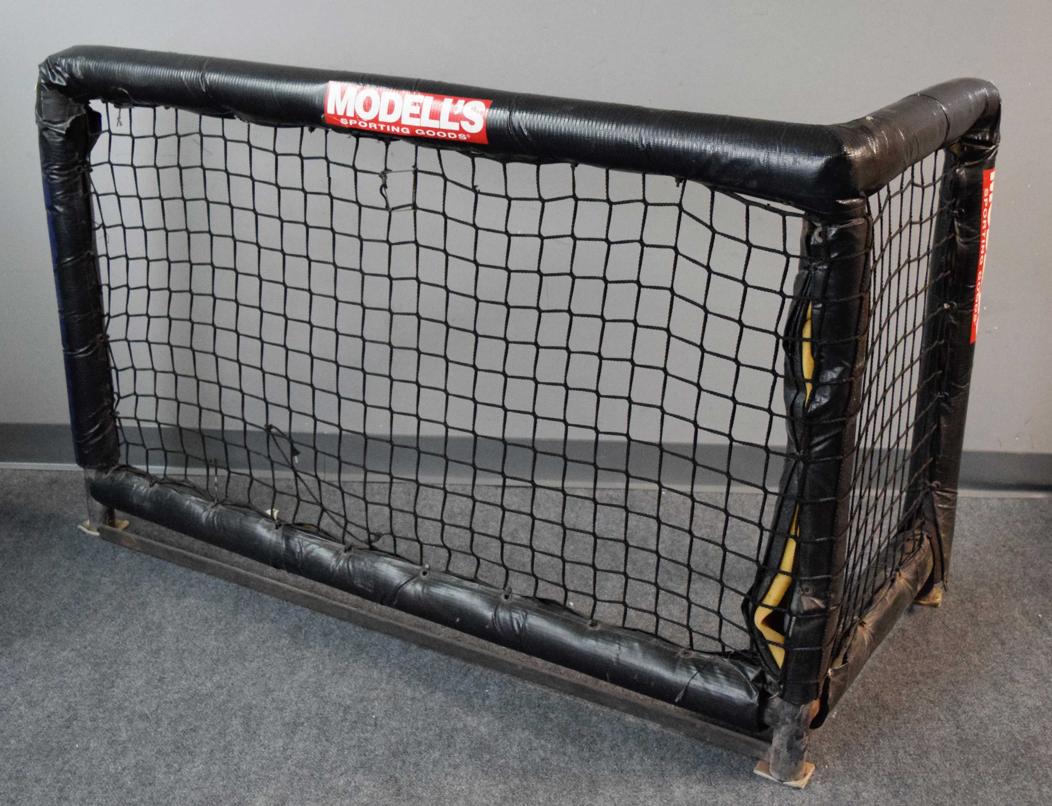 Description:End section of Shea Stadium dugout fence - L-shaped corner unit of Mets dugout rail. (EX-EX/MT). Mesh fence measuring approx. 3-feet tall and 56" long, with 24" side. This is the corner rail in front of Mets dugout that players often leaned on during home games. Modell's Sporting Goods advertising is on the black padding. Fairly minor wear: EX-EX/MT