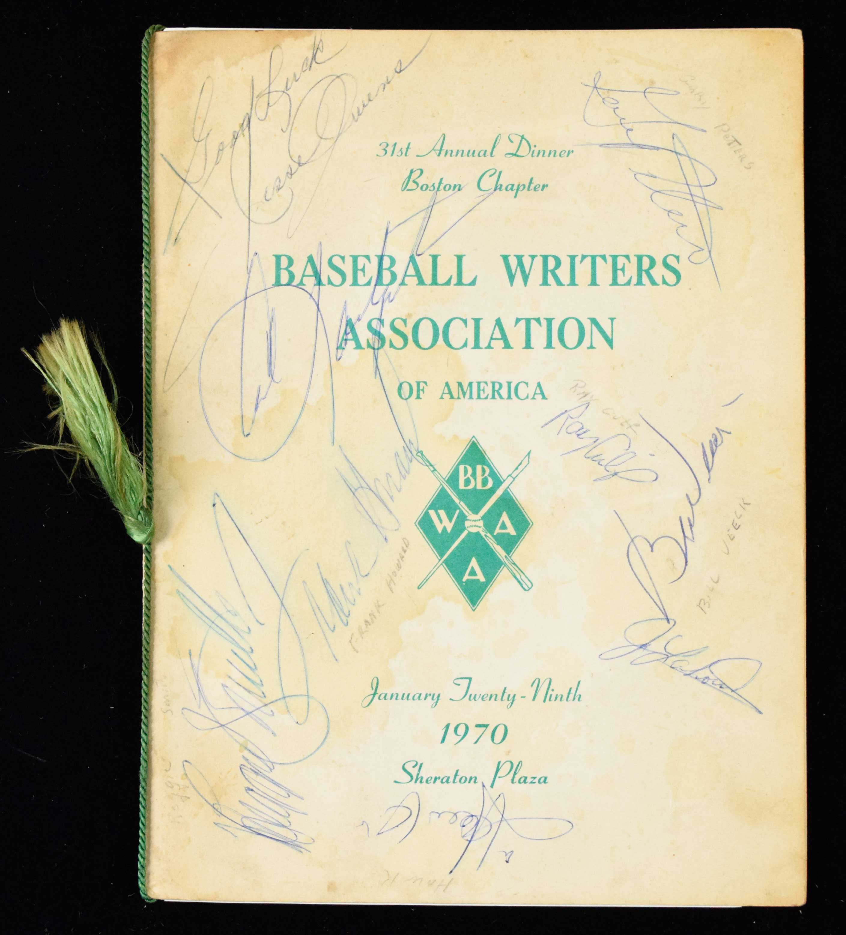 Description:Multi-signed 1970 Baseball Writers Association dinner program autographed by Jesse Owens + 9 more sports legends (VG). Signed on the cover by (9) including Jesse Owens, Carl Yastrzemski, Bill Veeck, Ken Harrelson signed "Hawk", Gary Peters, Frank Howard, Ray Culp, Reggie Smith, and Joe Lahoud. Signatures rate 6/7 to 9 (avg 8) out of 10. Fairly heavy staining on the cover: VG