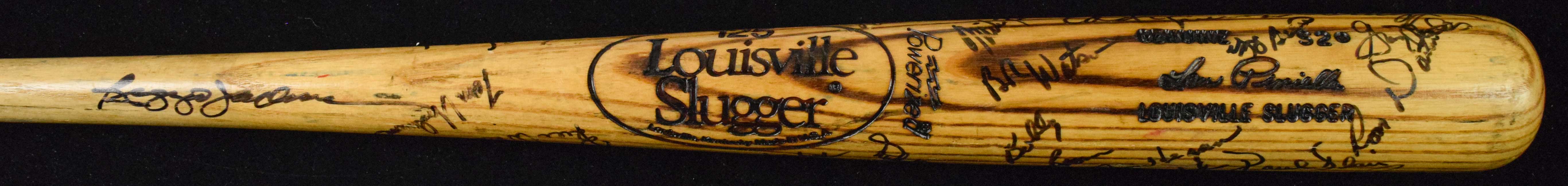 Description:1980 New York Yankees team signed Lou Piniella professional model baseball bat (VG/EX used). 34" Louisville Slugger S2 Lou Piniella model bat with his #14 written on the knob and on the end of the bat. Signed by (30) members of the 1980 American League East champion Yankees including Dick Howser, Yogi Berra, Reggie Jackson, Rich Gossage, Willie Randolph, Rudy May, Rick Cerone, Tommy John, Bucky Dent, Tom Underwood, Bob Watson, Ron Davis, Eric Soderholm, Graig Nettles, Lou Piniella, and others. Signatures rate 6 to 9 (avg 7/8) out of 10. The bat shows use, with heavy grain swelling to the barrel: VG/EX