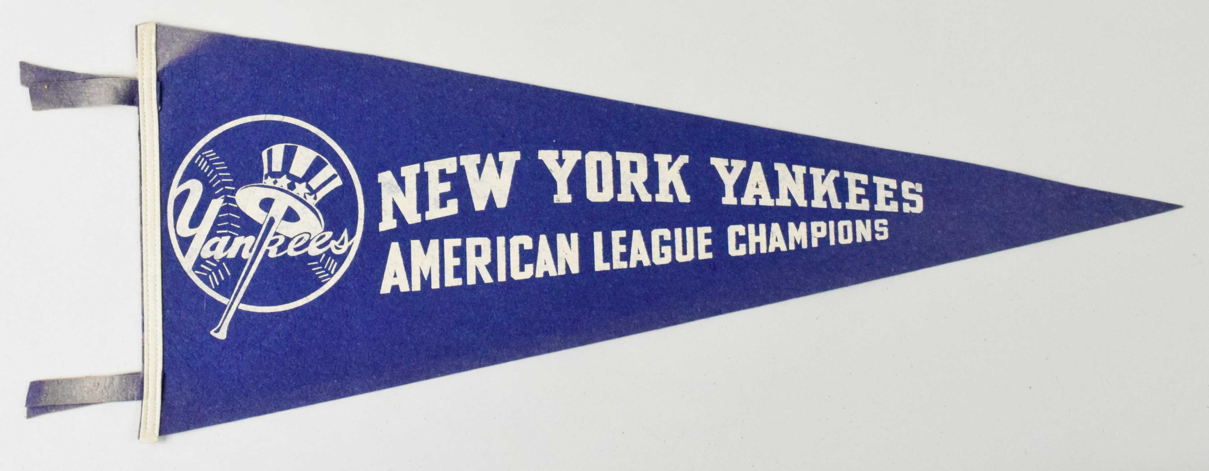Description:New York Yankees vintage American League Champions pennant, c.1940s-50s (EX). 27.5" blue pennant with white Yankees logo and text. Norsid Mfg. Co. tag is still intact on the bac. Minimal wear, but discoloration at the top left corner and to the tassels: EX