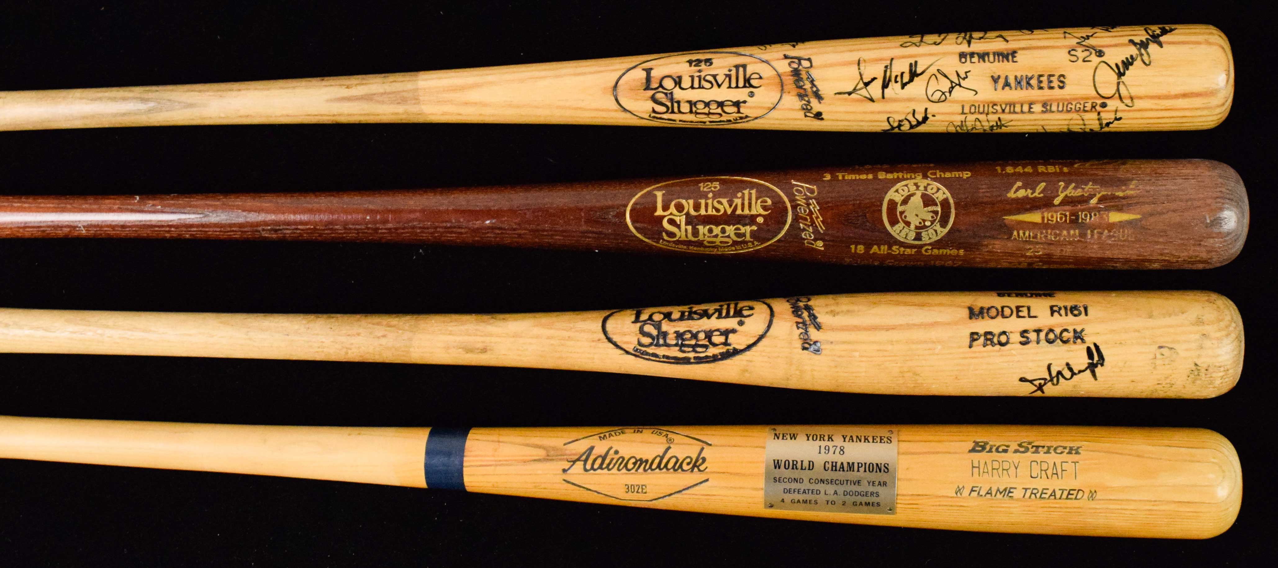 Description:Lot of (7) baseball bats including signed and commemoratives (FR/GD-NM). Signed bats include 35" Louisville Slugger commemorative Carl Yastrzemski bat signed by Yastrzemski (VG-VG/EX, surface loss at the end of the bat); 33" Louisville Slugger R161 Pro Stock bat signed by Dave Winfield (VG/EX used); and 33.75" Louisville Slugger S2 YANKEES pro stock bat signed by (20) members of the 1990 New York Yankees: Stump Merrill, Jesse Barfield, Tim Leary, Eric Plunk, Dave LaPoint, Steve Balboni, and others (EX used). Signatures rate 6/7 to 9 (avg 7/8) out of 10. Also includes c.1950s-60s 33" Hillerich & Bradsby 1529 Mickey Mantle store model bat (VG), c.1950s-60s 32" Mueller Perry Co. 130-2 Mickey Mantle store model bat (FR/GD large crack), c.1960s 31" Hillerich & Bradsby Co. Elston Howard model Little League bat (GD), and 33" Adirondack 1978 Yankees World Champions commemorative bat presented to scount and former MLB player & manager Harry Craft (NM).