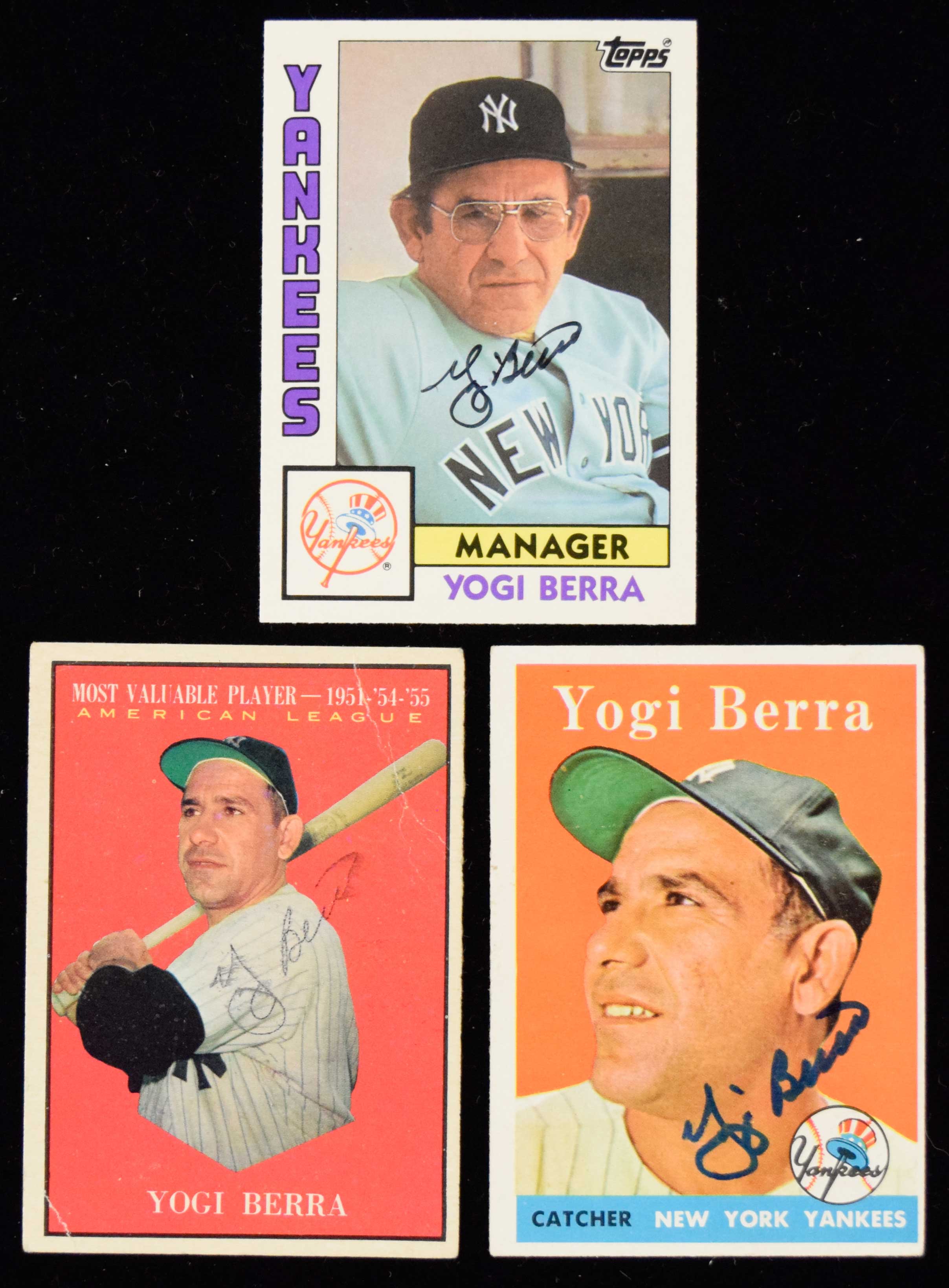 Description:Lot of (3) Yogi Berra signed baseball cards from 1958-1984 (GD-NM). Includes 1958 Topps #370 signed by Berra in blue marker rating 9 out of 10 (VG), 1961 Topps #472 signed by Berra in black ink rating 4/5 out of 10 (GD-G/VG), and 1984 Topps Traded #13T signed by Berra in black marker rating 9/10 out of 10 (NM).