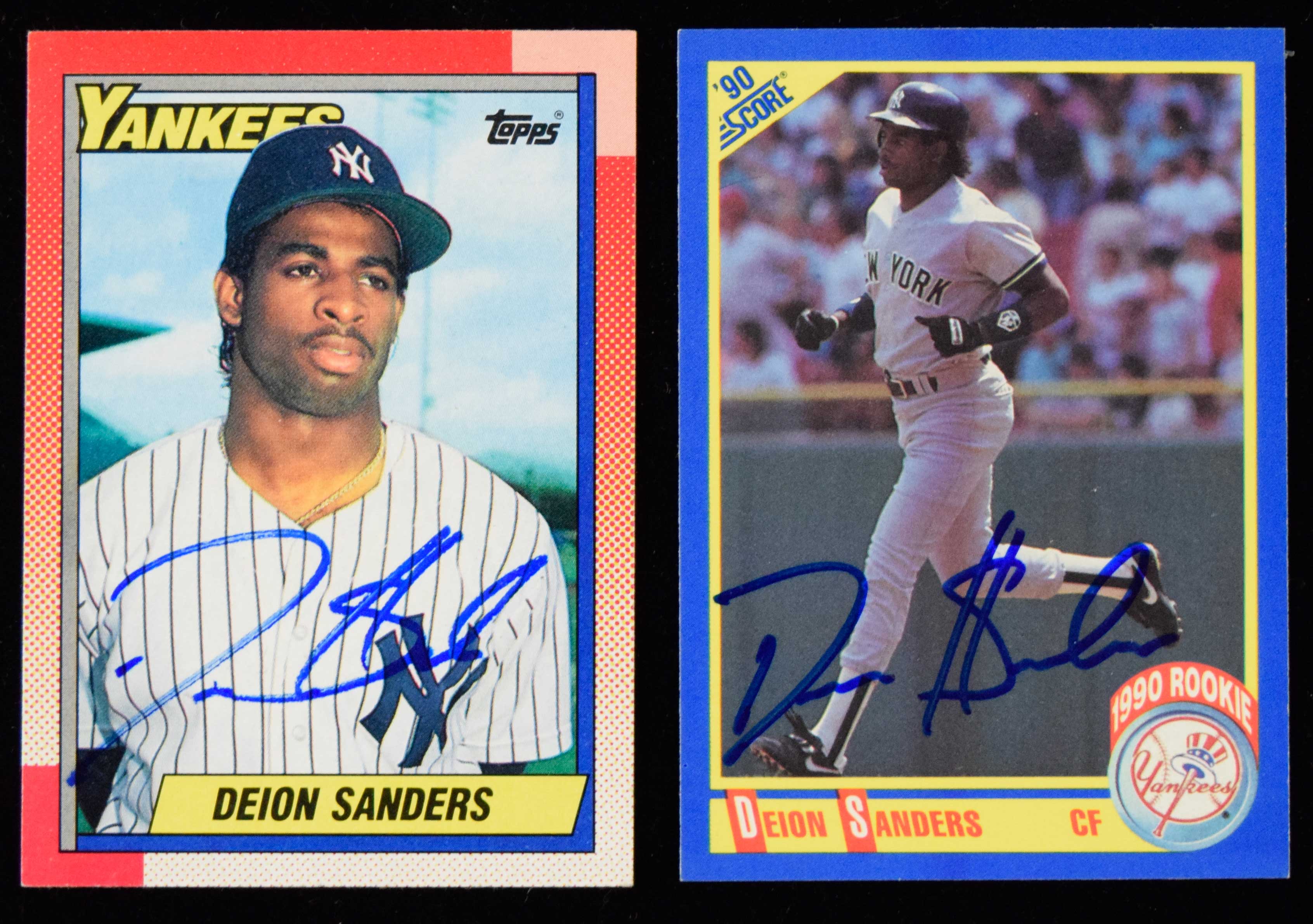 Description:Lot of (2) Deion Sanders signed 1990 rookie cards (NM-NM/MT). Includes 1990 Topps #61 signed by Sanders in blue marker rating 8 out of 10, and 1990 Score #586 signed by Sanders in blue marker rating 9/10 out of 10: NM-NM/MT