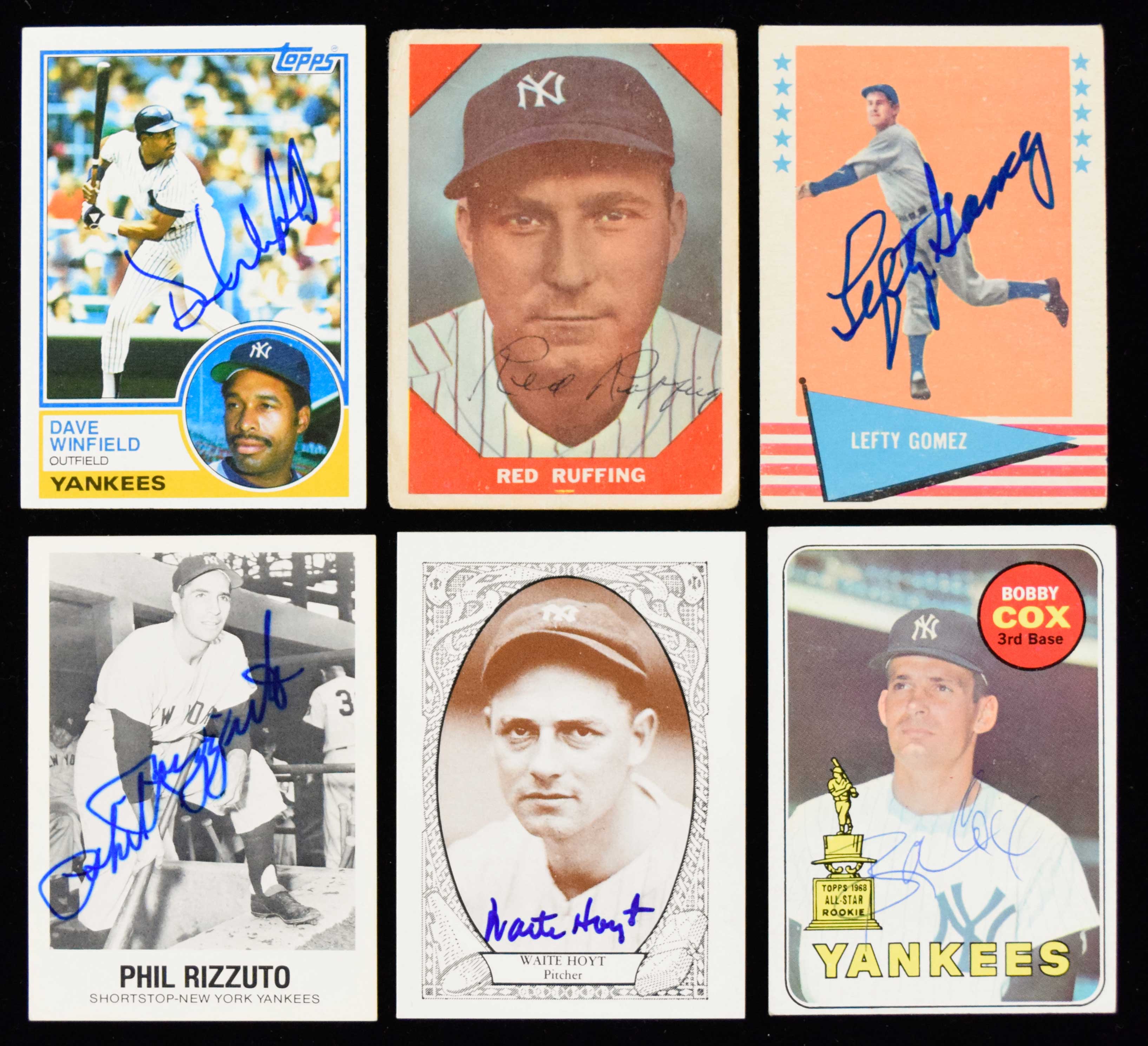 Description:Lot of (13) New York Yankees stars & HOFers signed baseball cards from 1957-2001 (VG-NM/MT). 1957 Topps #192 signed by Jerry Coleman, 1960 Topps #83 signed by Tony Kubek, 1960 Fleer #63 signed by Red Ruffing, 1961 Fleer #34 signed by Lefty Gomez, 1969 Topps #237 signed by Bobby Cox, 1977 TCMA #37 signed by Phil Rizzuto, 1979 TCMA #16 signed by Waite Hoyt, 1980 Topps #140 signed by Goose Gossage, 1981 Topps #582 signed by Gaylord Perry, 1982 G.S. Gallery #10 signed by Phil Rizzuto, 1983 Topps #770 signed by Dave Winfield, 1988 Topps #392 signed by Dave Winfield, and 2001 Topps #170 signed by Roger Clemens. Signatures rate 4 (Kubek) to 10 (avg 7/8) out of 10. Most cards appear to average VG/EX-EX overall. Range: VG-NM/MT