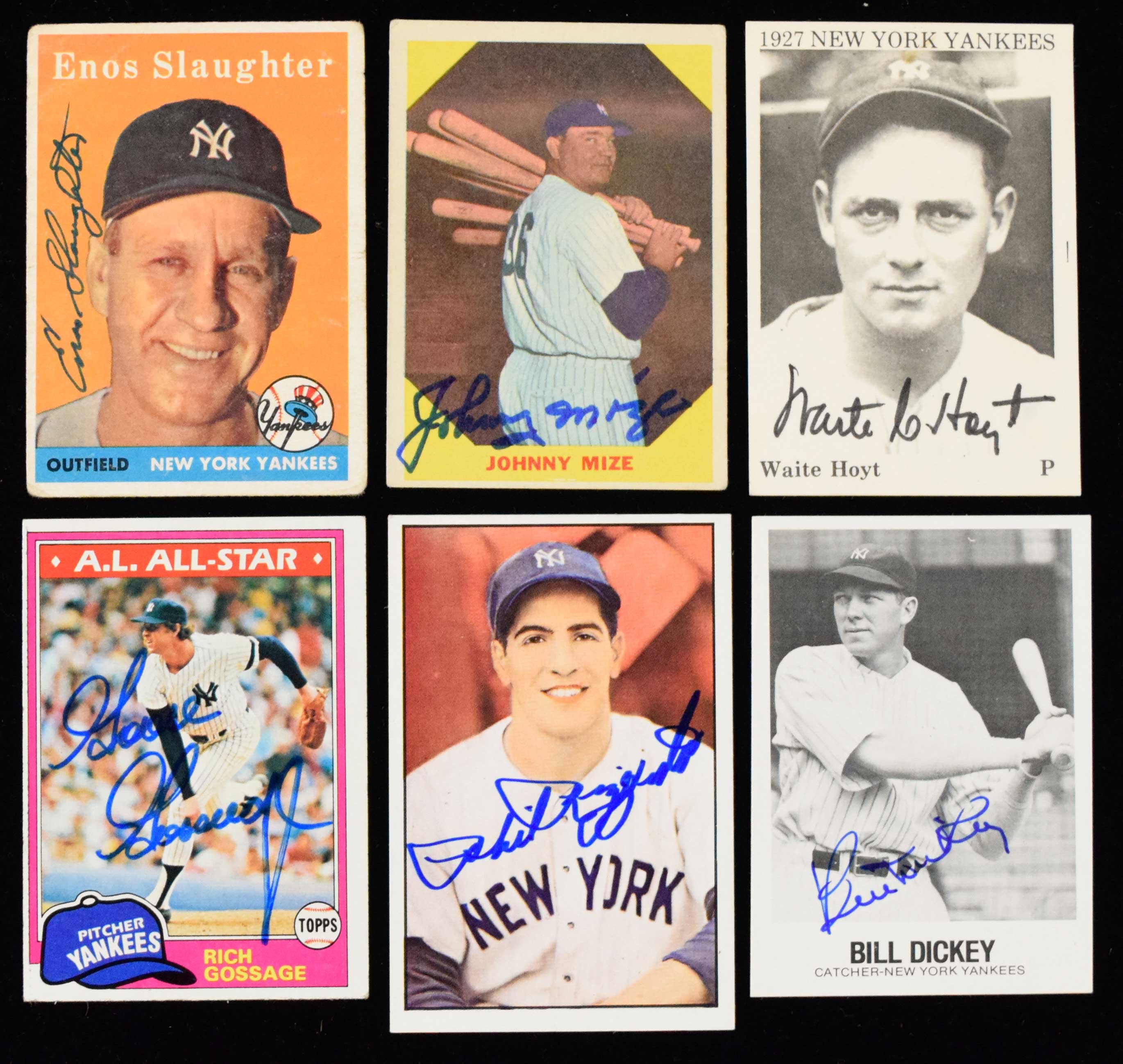 Description:Lot of (13) New York Yankees stars & HOFers signed baseball cards from 1958-2001 (VG-NM/MT). Includes 1958 Topps #142 signed by Enos Slaughter, 1960 Fleer #38 signed by Johnny Mize, 1961 Topps #265 signed by Tony Kubek, 1963 Topps #20 signed by Tony Kubek, 1975 TCMA signed by Waite Hoyt, 1979 TCMA #68 signed by Bill Dickey, 1979 TCMA Baseball History #240 signed by Enos Slaughter, 1981 Topps #s 460 signed by Goose Gossage, 1982 Big League Collectibles #45 signed by Phil Rizzuto, 1982 Donruss #635 signed by Bob Lemon, 1987 Topps #770 signed by Dave Winfield, 1993 Upper Deck #556 signed by Wade Boggs, and 2001 Fleer Tradition "Diamond Tributes" #6 signed by Roger Clemens. Signatures rate 4 (Kubek 1963 Topps) to 10 (avg 7/8) out of 10. Most cards appear to average VG/EX-EX overall. Range: VG-NM/MT