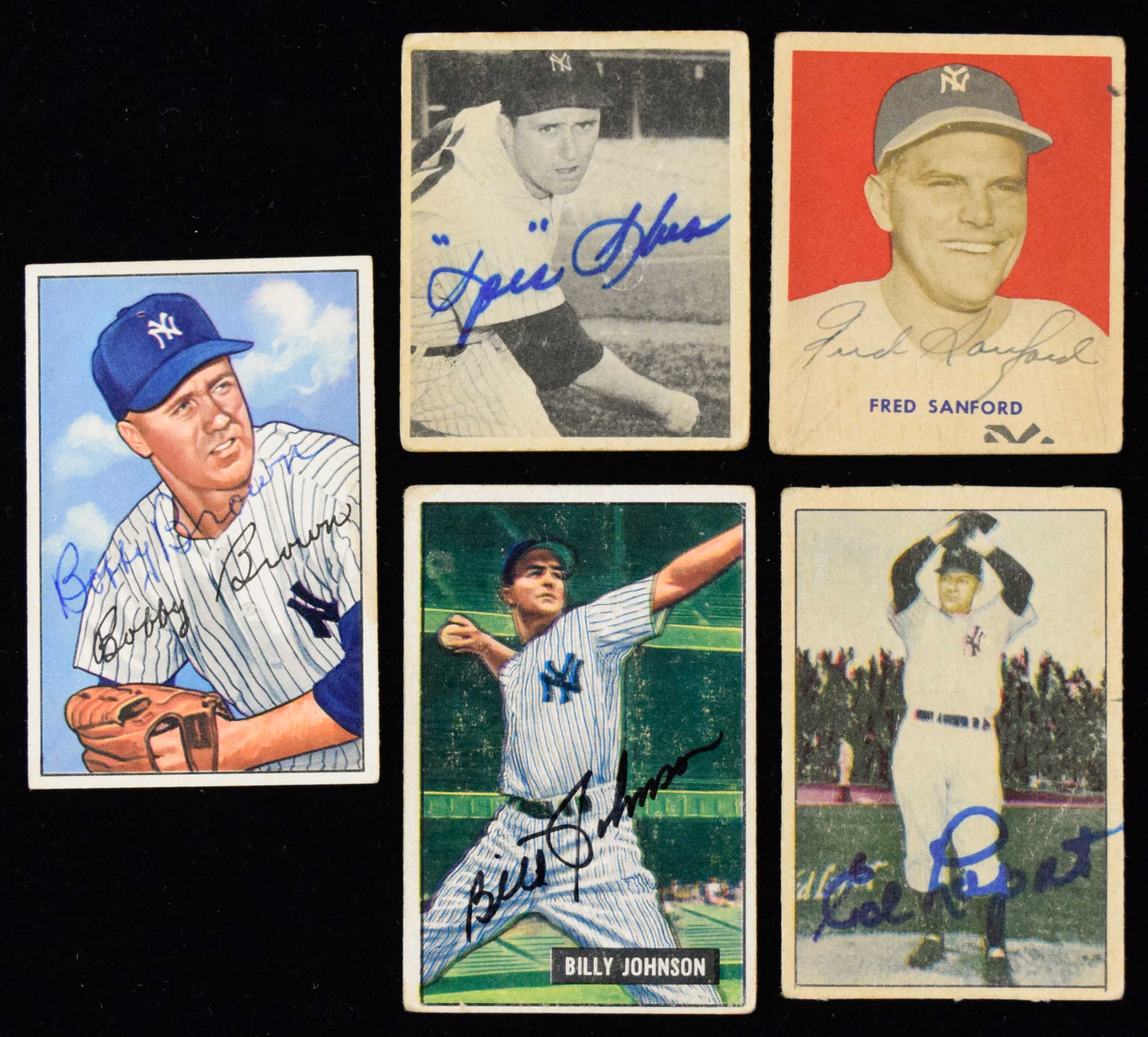 Description:Lot of (38) New York Yankees signed baseball cards from 1948-1959 (FR/GD-EX/MT). Includes 1948 Bowman: Spec Shea; 1949 Bowman: Spec Shea and Fred Sanford; 1951 Bowman: Billy Johnson; 1952 Berk Ross: Ed Lopat and Joe Collins; 1952 Bowman: Bobby Brown and Charlie Silvera; 1955 Bowman: Tommy Byrne; 1957 Topps: Johnny Kucks, Gil McDougald, Bob Turley, Bobby Shantz, Joe Collins, and Al Cicotte; 1958 Topps: Gil McDougald, Sal Maglie, Darrell Johnson, Johnny Kucks, Tom Sturdivant, Don Larsen, Jerry Lumpe, Bob Grim, Moose Skowron, Bob Turley, Ryne Duren, Art Ditmar, and Al Cicotte; 1959 Topps: Murry Dickson, Andy Carey, Bobby Richardson, Bill Skowron, Zack Monroe, Deron Johnson, Don Larsen, Bobby Shantz, Norm Siebern, and Marv Throneberry. Signatures rate 3/4 (Maglie) to 10 (avg 8) out of 10. Most cards appear to average VG overall. Range: FR/GD-EX/MT