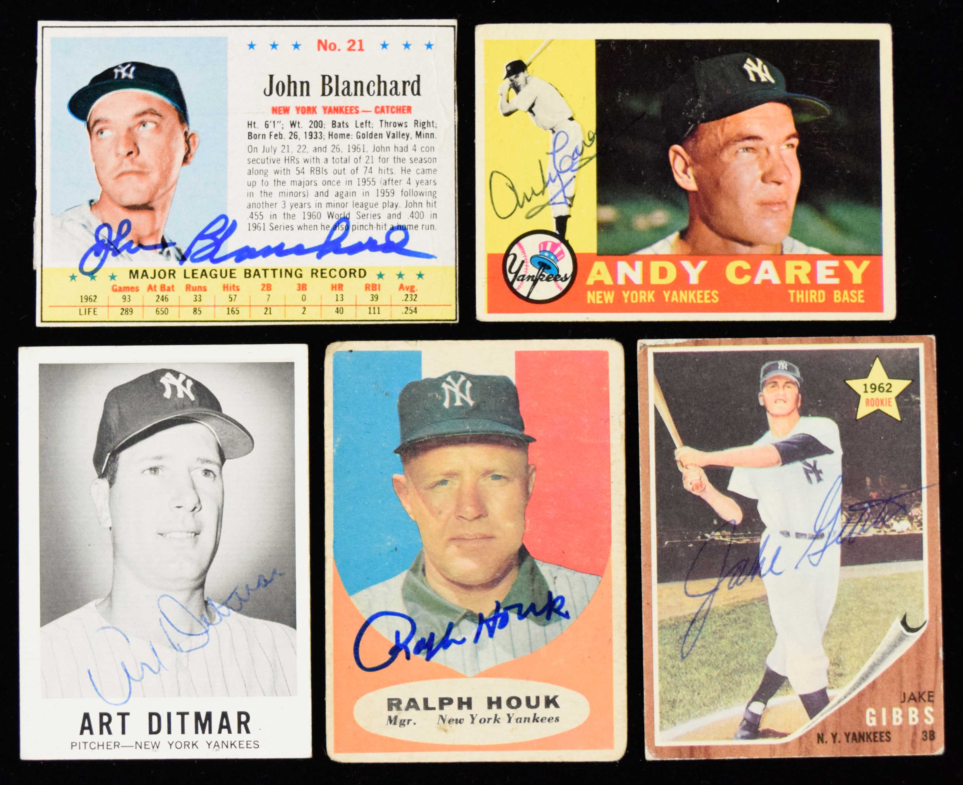 Description:Lot of (39) New York Yankees signed baseball cards from 1960-1966 (GD-EX/MT). Includes 1960 Topps: Ken Hadley, Bill Short, Hector Lopez, Eli Grba, Andy Carey, Elmer Valo, John Blanchard, Joe DeMaestri, John James, and Ken Hunt; 1960 Leaf: John Gabler and Art Ditmar; 1961 Topps: Deron Johnson, Ralph Houk, Luis Arroyo, Bill Stafford, Danny McDevitt, Ryne Duren, Ralph Terry, and Art Ditmar; 1962 Topps: Moose Skowron, Bob Cerv, Ken Johnson, Jake Gibbs, Hal Stowe, Bill Gardner, and Luis Arroyo; 1962 Post Cereal: Bill Skowron; 1963 Topps: Bud Daley, Stan Williams, Jim Coates, Phil Linz, Hal Brown (personalized to Barry), Ralph Terry, Tex Clevenger, Dale Long, and Bill Kunkel; 1963 Post: John Blanchard; 1966 Topps: Hector Lopez (personalized to Barry). Signatures rate 4/5 to 10 (avg 7/8) out of 10. Most cards appear to average VG-VG/EX overall. Range: GD-EX/MT
