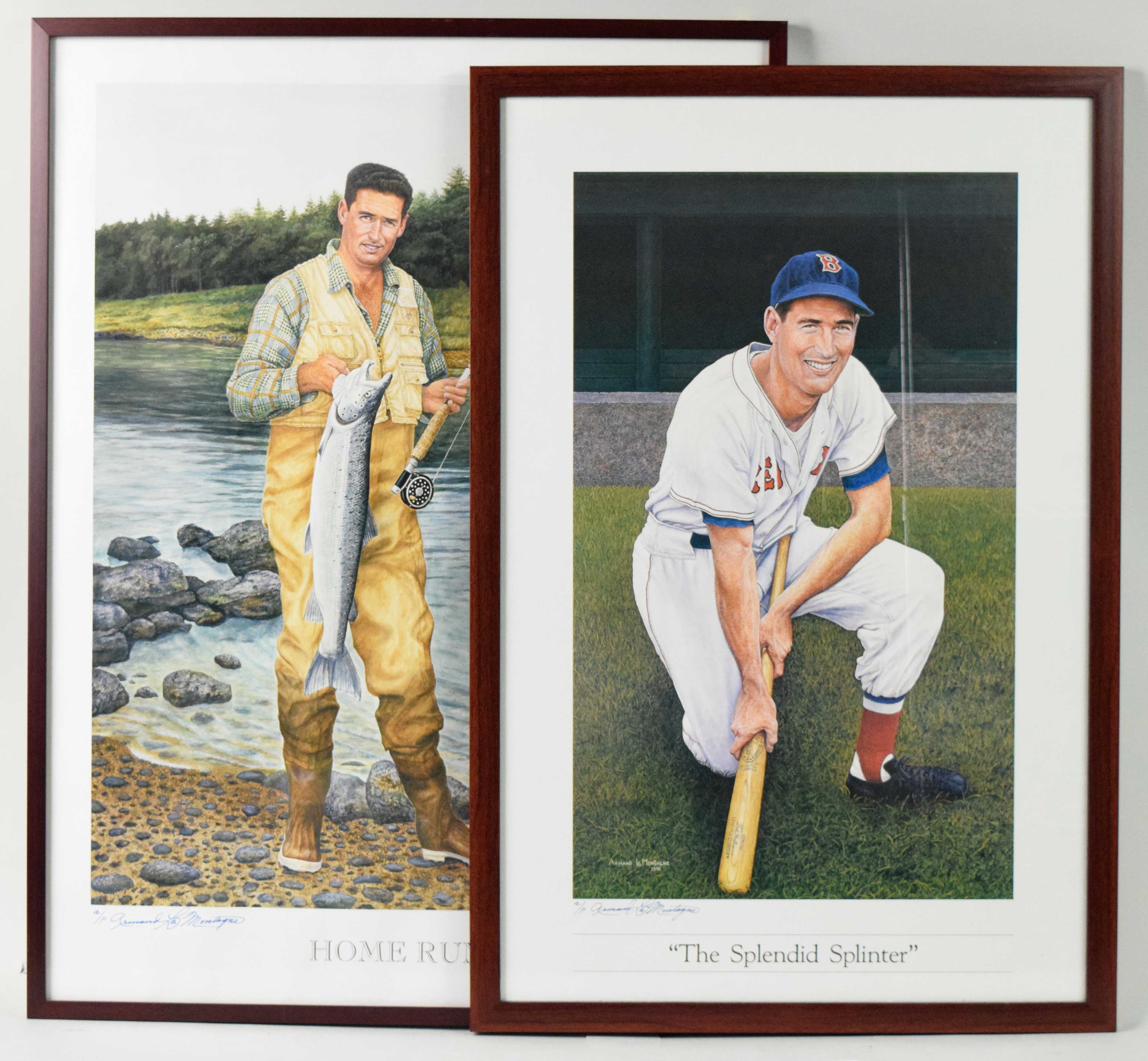 Description:Lot of (2) Armand LaMontagne signed Ted Williams artist proof lithographs (NM-NM/MT framed). Includes 25"x37" framed 1991 "The Splendid Splinter" print signed by LaMontagne in blue marker with "a/p" inscription, and 29"x38.5" framed 1994 "Home Run" fishing print signed by LaMontagne in blue marker with "a/p" inscription. Signatures rate 9 to 10 out of 10. Due to framing, complete conditions are unknown: NM-NM/MT overall