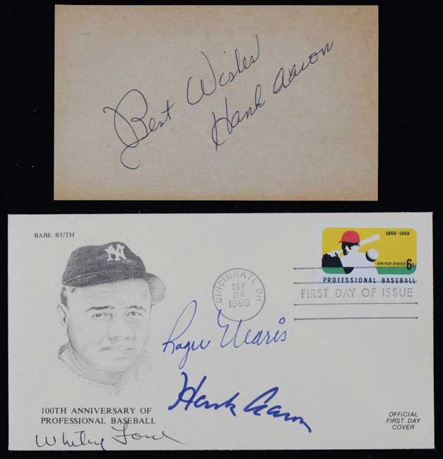 Description:Hank Aaron signed index card plus Roger Maris signed Babe Ruth commemorative postal cover (EX-NM see description). Includes a vintage 3"x5" index card signed by Hank Aaron in blue ink (EX-EX/MT toning); and 1969 Babe Ruth postal cover signed by Roger Maris in blue marker (additional Hank Aaron signature is secreterial and Whitey Ford is possibly secreterial). Signatures rate 8 to 9/10 out of 10: EX-NM