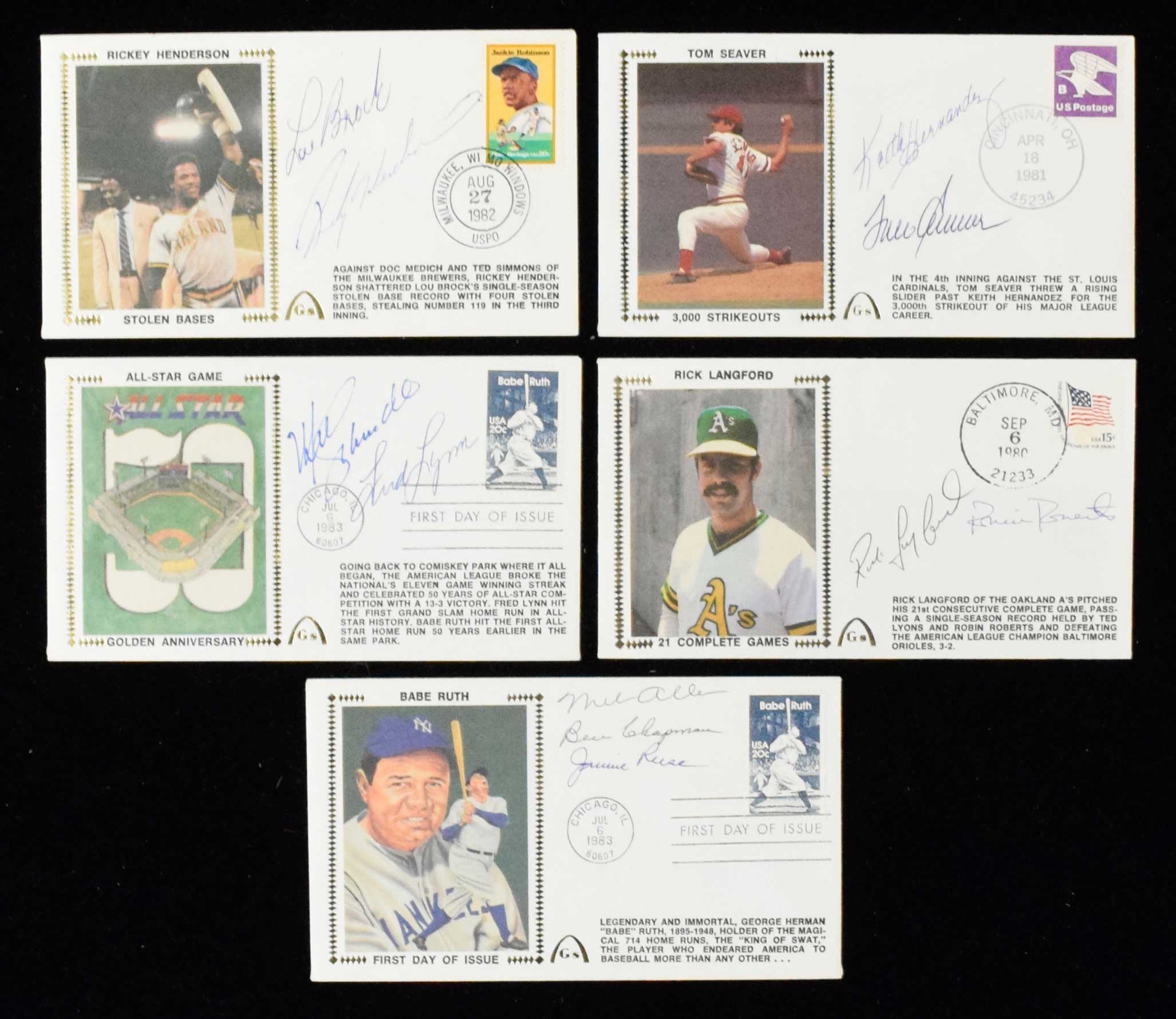 Description:Lot of (5) multi-signed commemorative baseball postal covers from 1980-1983 including HOFers (NM-NM/MT). Includes 1981 "21 Complete Games" FDC dual-signed by Rick Langford and previous record holder Robin Roberts; 1981 Tom Seaver 3000th Strikeout FDC dual-signed by Seaver and Keith Hernandez (batter he struck out); 1982 Stolen Bases FDC dual-signed by Lou Brock and Rickey Henderson; 1983 All-Star Game FDC dual-signed by Mike Schmidt and Fred Lynn; 1983 Babe Ruth FDC multi-signed by Mel Allen, Ben Chapman, and Jimmie Reese. Signatures rate 8 to 10 out of 10: NM-NM/MT