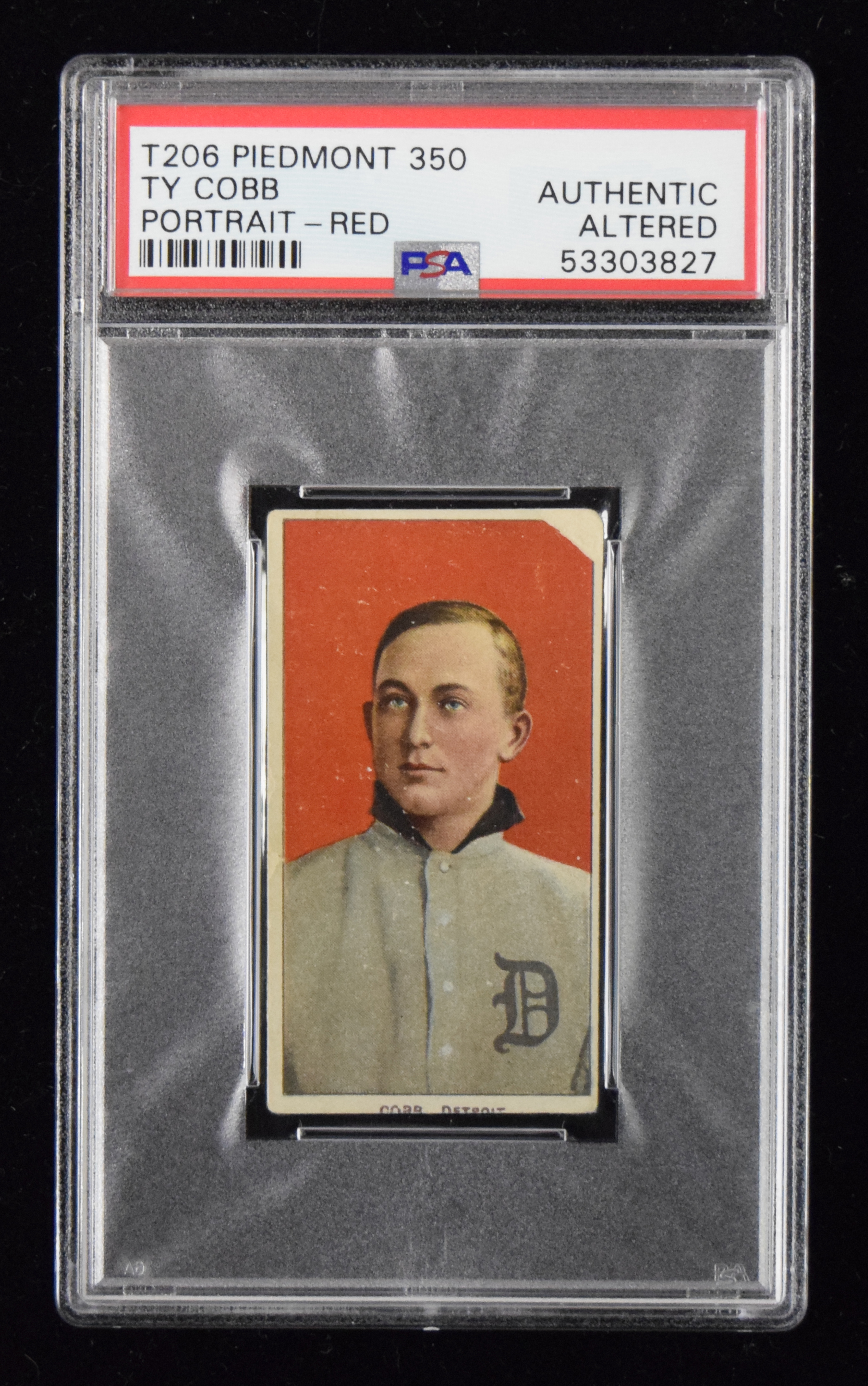 Description:1909-11 T206 Ty Cobb (Portrait, red background) (PSA "Authentic Altered") Piedmont (350) back. Nice color and registration. Card has been trimmed at edges and has other wear including paper loss and an ink mark on back: PSA "Authentic Altered" ($1,000-$2,000)