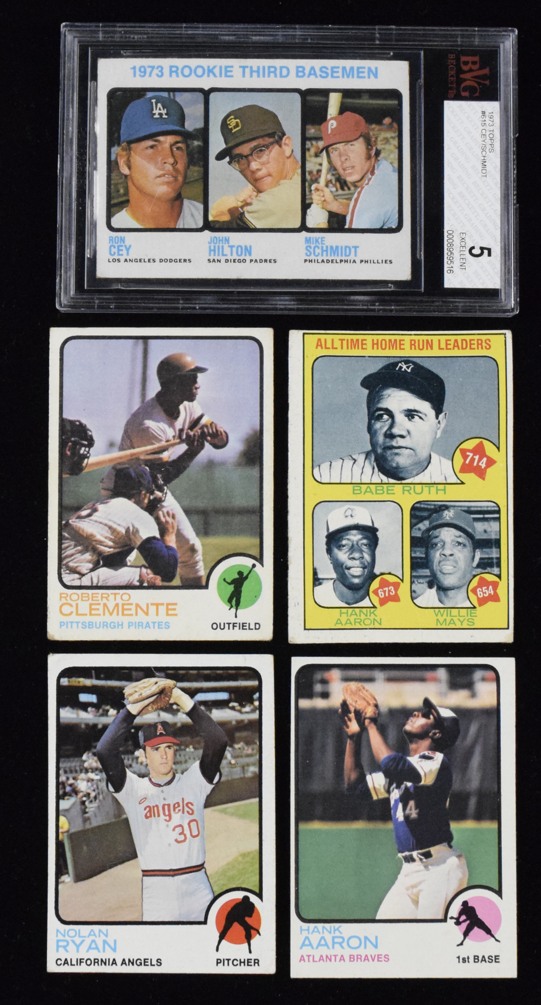1973 Topps Baseball card set with graded Schmidt rookie (PR/FR-NM). Key cards grade: #s 1 Home Run Leaders (FR/GD-GD), 50 Roberto Clemente (GD), 100 Hank Aaron (EX miscut), 220 Nolan Ryan (VG), 615 Mike Schmidt rookie graded Beckett 5 (EX). Missing checklist #588. Remainder appear to average VG/EX-EX overall. Range: PR/FR-NM