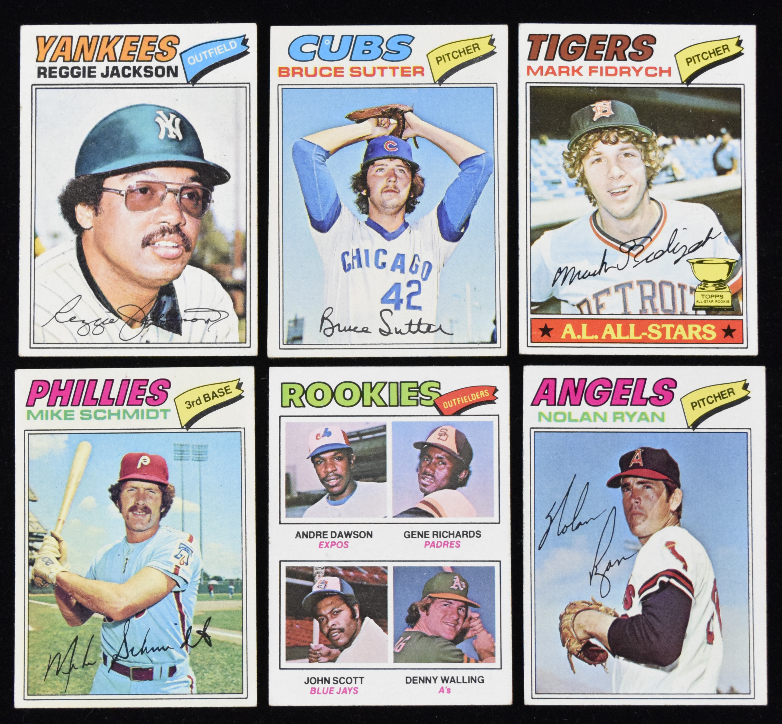 Description:1977 Topps Baseball card set (VG-NM/MT). Key cards grade: #s 265 Fidrych rookie (EX oc), 473 Andre Dawson rookie (VG/EX-EX), 650 Nolan Ryan (VG/EX oc). Remainder appear to average EX overall. Range: VG-NM/MT