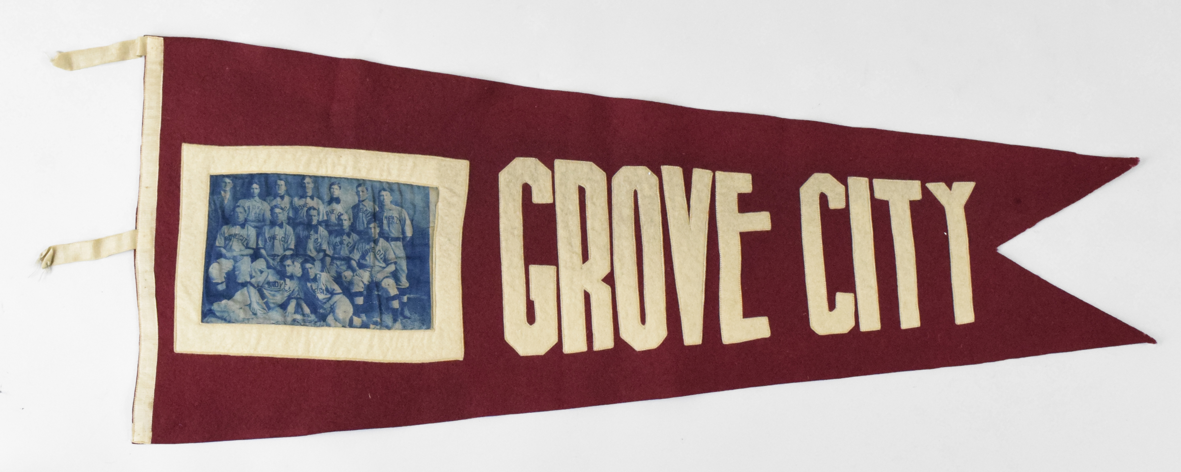 Description:Grove City College baseball team photo pennant, c.1910s (EX). 34" maroon pennant with white lettering, and team photo at the left side. Missing bottom tassels, but fairly minor wear otherwise: EX overall