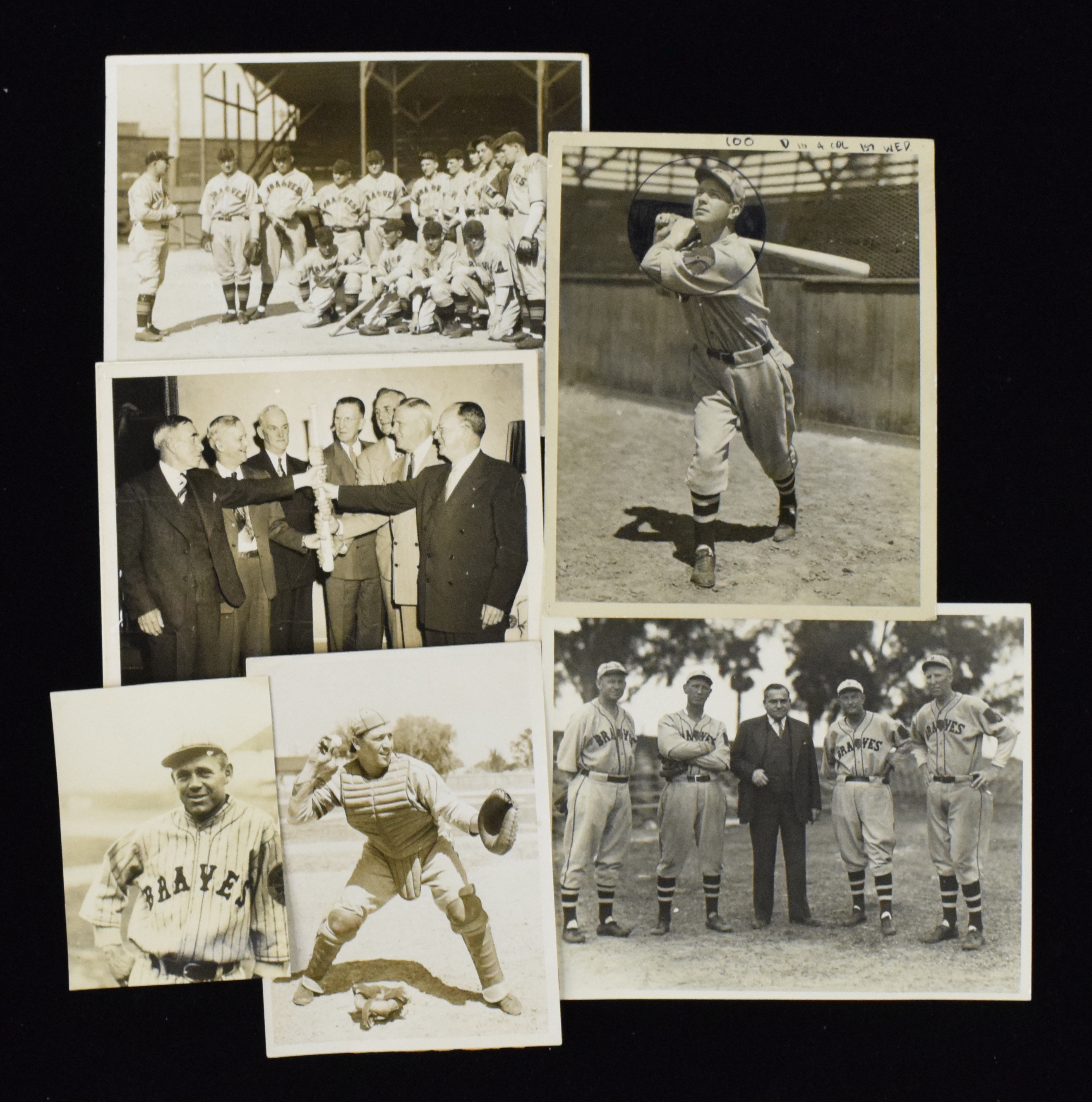 Description:Lot of (6) c.1920s-50s Boston Braves related photographs (GD-EX) includes image of c.1931 Bill McKechnie with team members at Spring Training photo c.1929 Coaching staff incl. Bill McKechnie ("Thorne Photo" stamp on back); photo of 1914 Miracle Braves team members at a reunion with 1951 dated paper caption on back (photo mounted to board); images of individual players (as identified on backs) including Rupert Thompson, Phil Masi, and Walter Gautreau. Photos range from approx. 5"x7" to 8"x10" and there are varying degrees/types of wear throughout: GD-EX