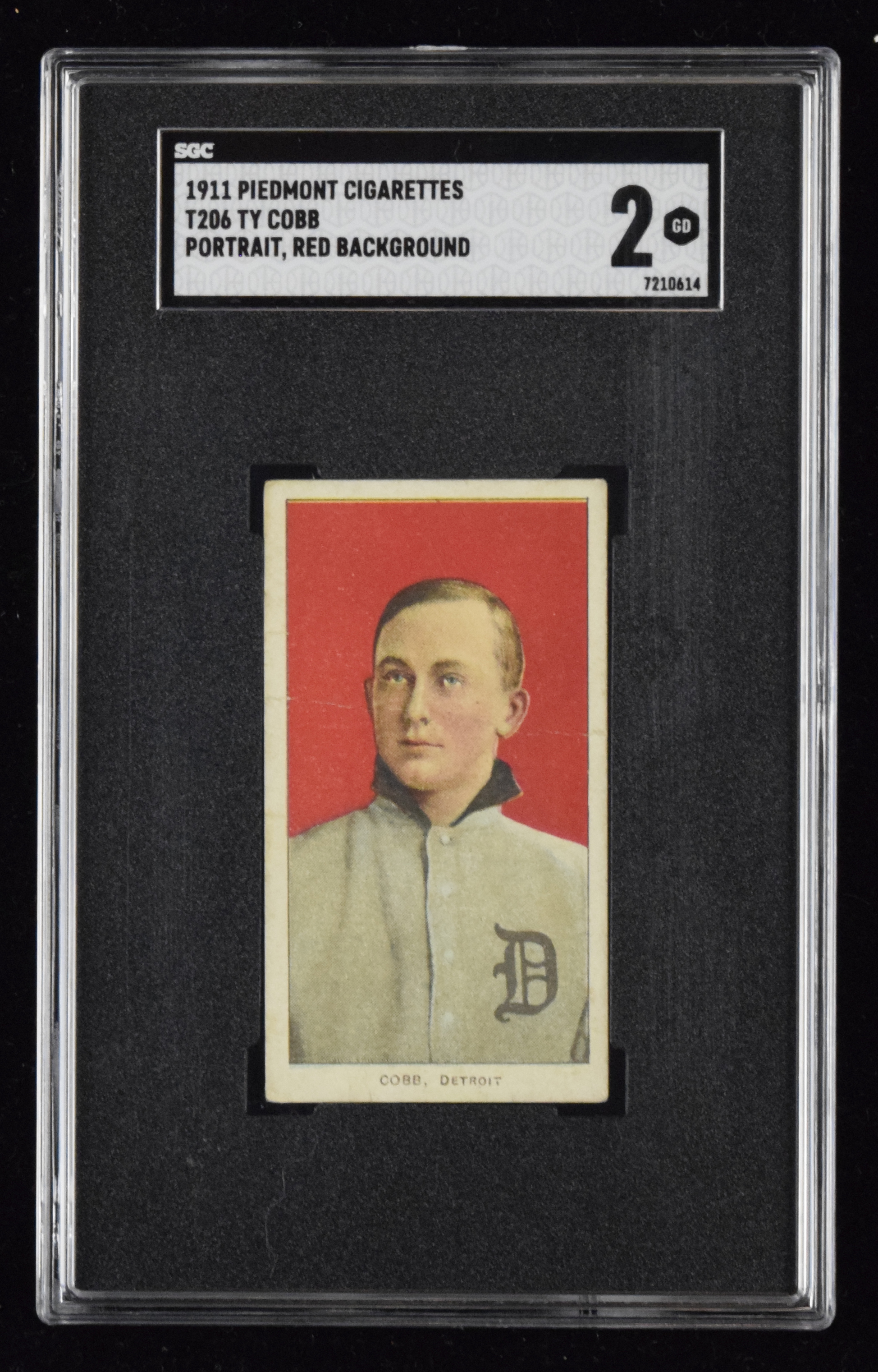 Description:1909-11 T206 Ty Cobb (Portrait, red background) - exceptional eye appeal for the grade (SGC 2 GD) Key card is very nicely centered with outstanding bold color and crisp registration. A heavy horizontal crease accounts for technical grade: SGC 2 GD ($5,000-$7,500)
