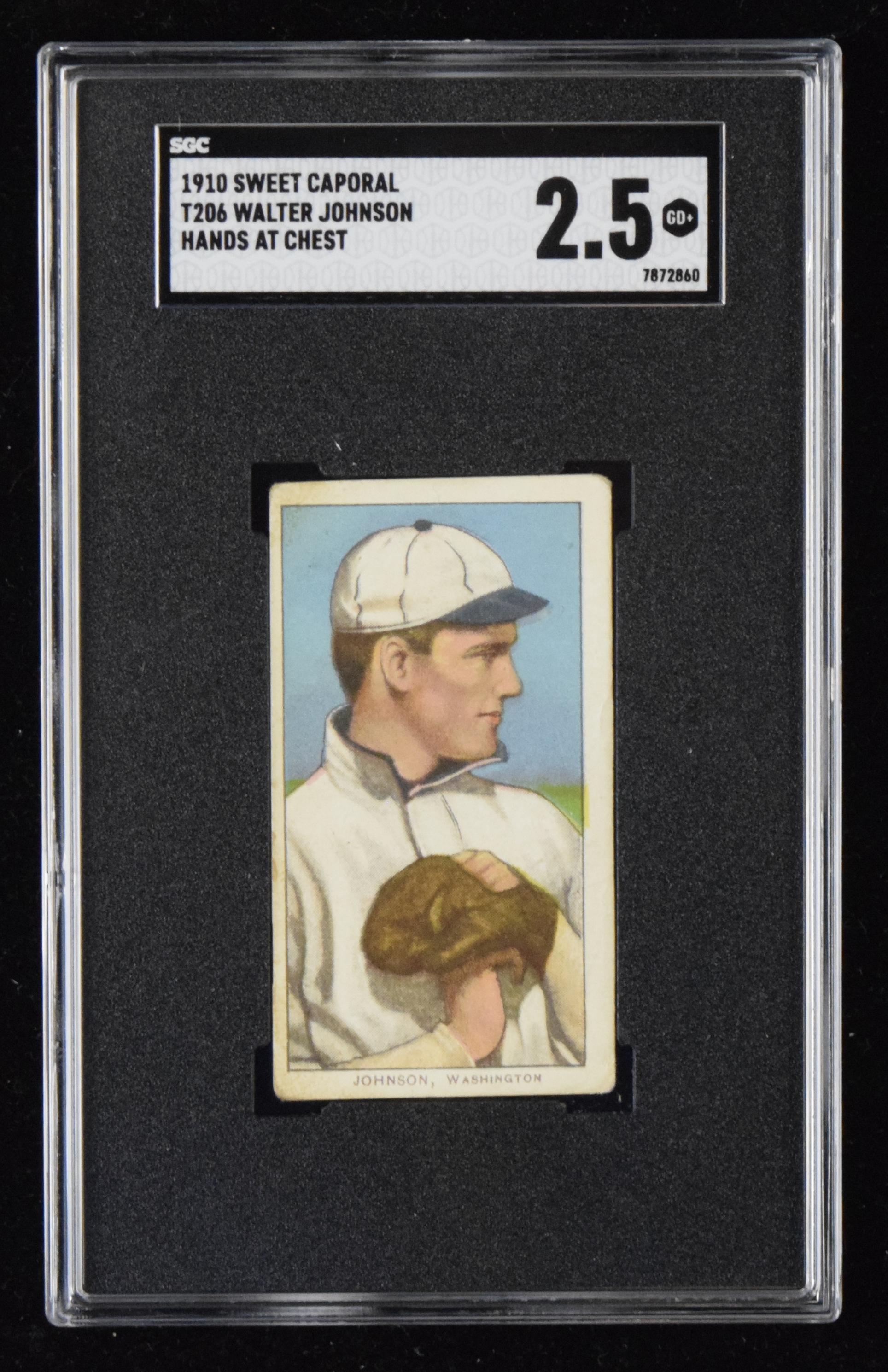 Description:1909-11 T206 Walter Johnson (Pitching) (SGC 2.5GD+) Crisp and well registered image sits off center on card with some light/mild scattered wear: SGC 2.5 GD+ ($1,000-$2,000)