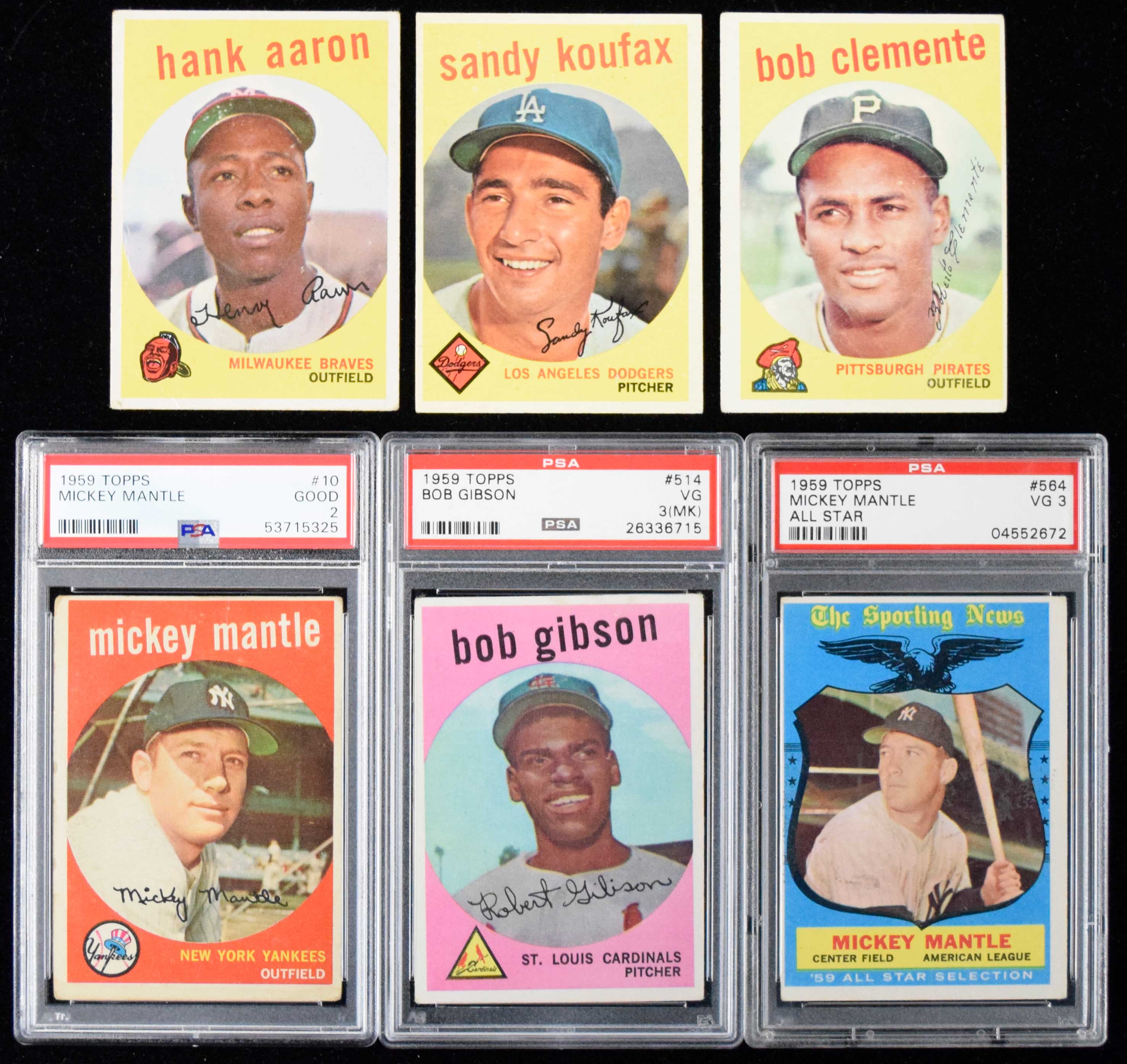 1959 Topps Baseball complete set (572 cards) with (8) PSA graded incl. Mantle and Gibson (Avg. VG) Keys: #10 Mantle (PSA Good 2), 20 Snider (VG), 50 Mays (GD/VG), 150 Musial (FR/GD), 163 Koufax (VG/EX, some wax on front), 180 Berra (GD/VG), 200 Giles (PSA VG 3), 202 Maris (PSA VG 3), 212 Fence Busters (VG), 317 Ashburn/Mays (VG/EX), 338 Anderson (EX OC), 350 Banks (VG/EX), 360 Kaline (GD/VG), 380 Aaron (GD), 387 Drysdale (EX), 430 Ford (PSA VG 3), 435 Robinson (VG), 439 Robinson (EX), 450 Mathews (miscut), 461 Mantle HR (GD), 464 Mays Catch (VG), 478 Clemente (GD), 514 Gibson (PSA VG 3 MK - ink mark on front), 515 Killebrew (VG/EX), 543 Trio (EX-EX/MT), 552 Stengel (PSA VG 3), 553 Campanella (miscut), 559 Banks (PSA VG 3), 561 Aaron (VG-VG/EX), 563 Mays (EX diamond cut), and 564 Mantle (PSA VG 3). Average VG condition throughout with GD-EX general range and there are a small portion lesser and a few nicer mixed in: Avg. VG ($2,000-$4,000)
