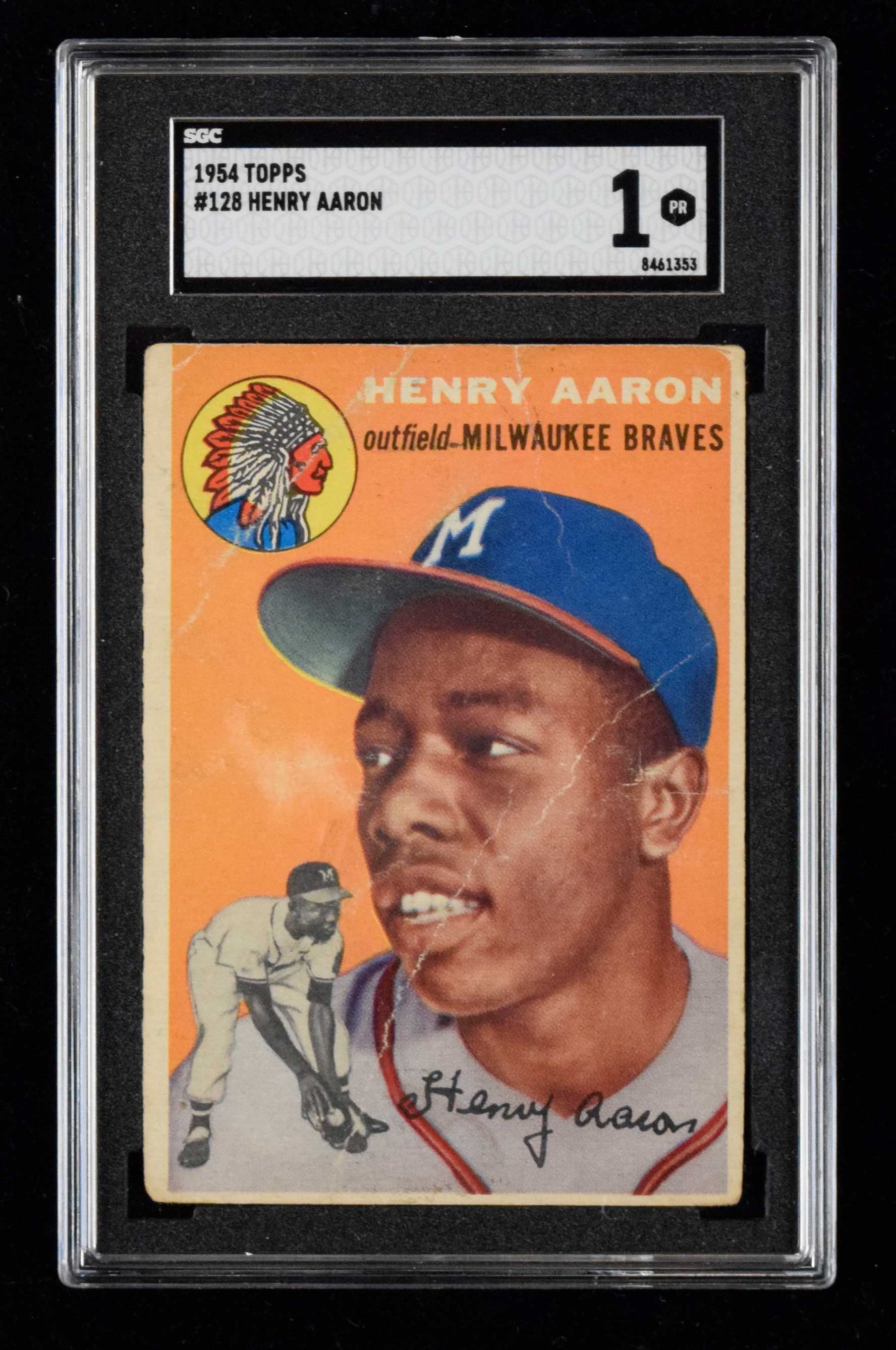 Description:1954 Topps #128 Hank Aaron Rookie (SGC 1 PR) Wear includes creasing and wrinkles and it appears there is a partially erased pencil mark on front: SGC 1 PR ($1,000-$2,000)