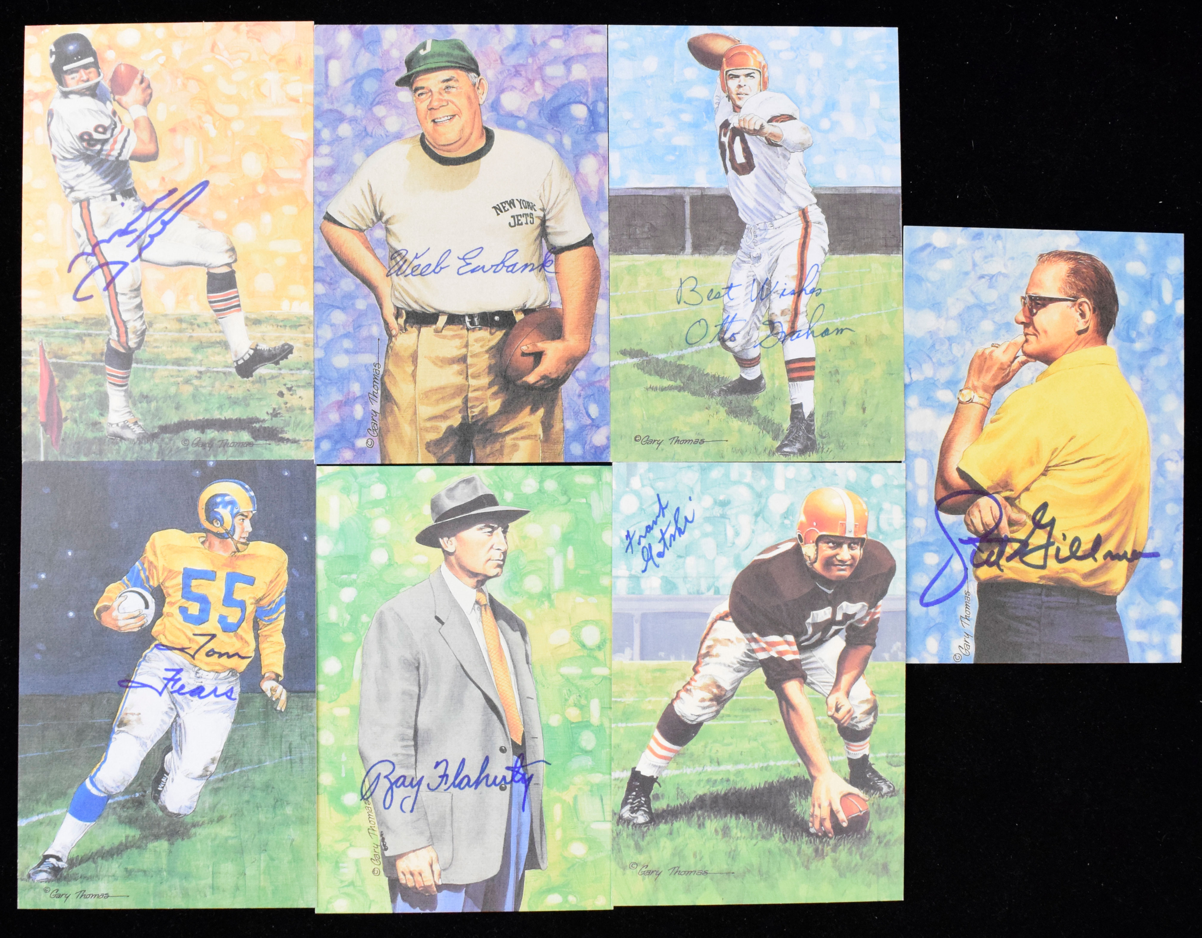 Description:Lot of (7) Football HOFers signed Goal Line Art cards (NM-NM/MT). Includes Otto Graham, Tom Fears, Frank Gatski, Mike Ditka, Weeb Ewbank, Ray Flaherty, and Sid Gillman. Signatures rate 8 to 10 out of 10: NM-NM/MT