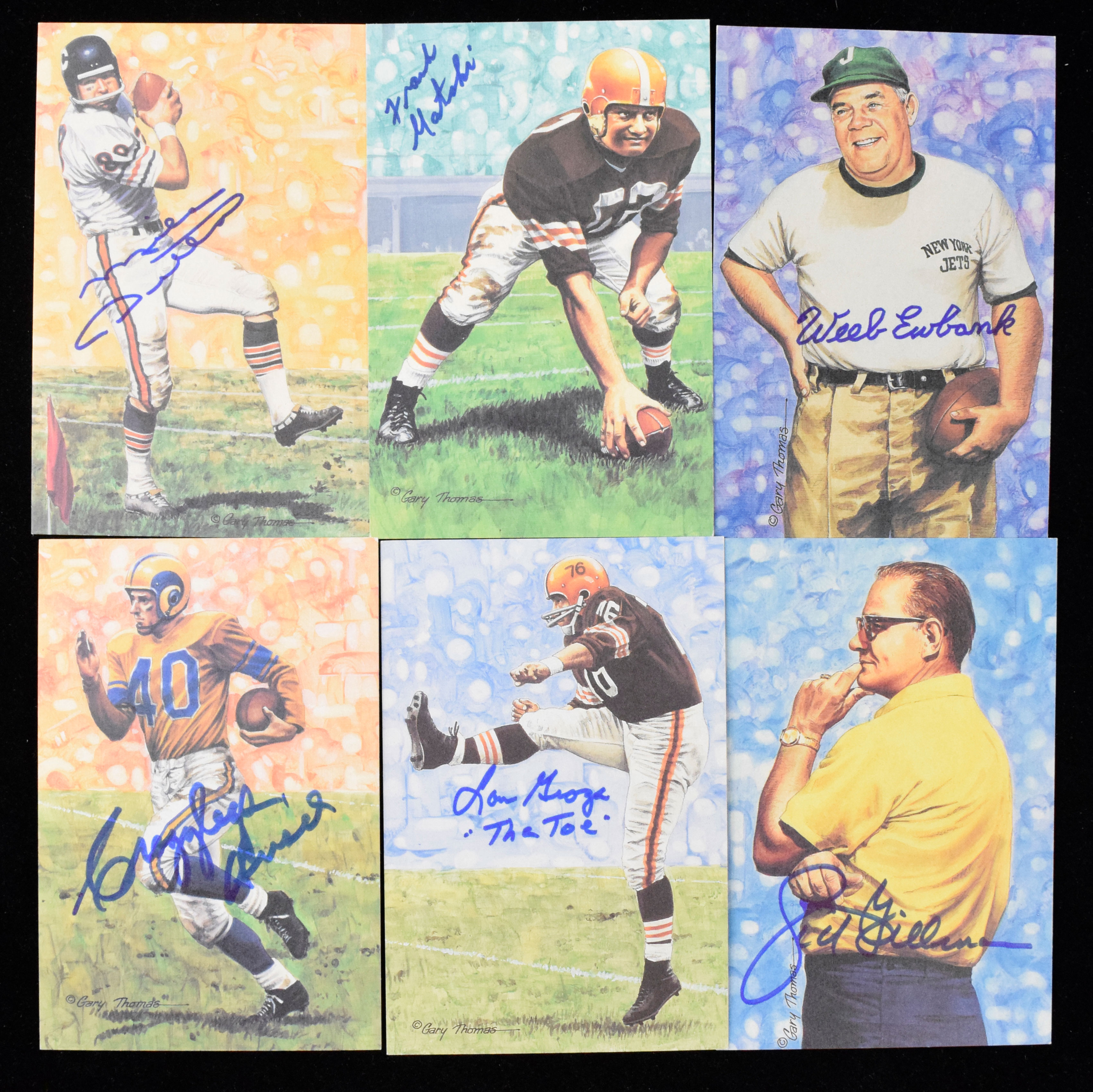 Description:Lot of (9) Football HOFers signed Goal Line Art cards (NM-NM/MT). Includes Frank Gatski, Lou Groza with "the Toe" inscription, Stan Jones, Crazylegs Hirsch, Sam Huff, Deacon Jones, Mike Ditka, Sid Gillman, and Weeb Ewbank. Signatures rate 8 to 10 out of 10: NM-NM/MT