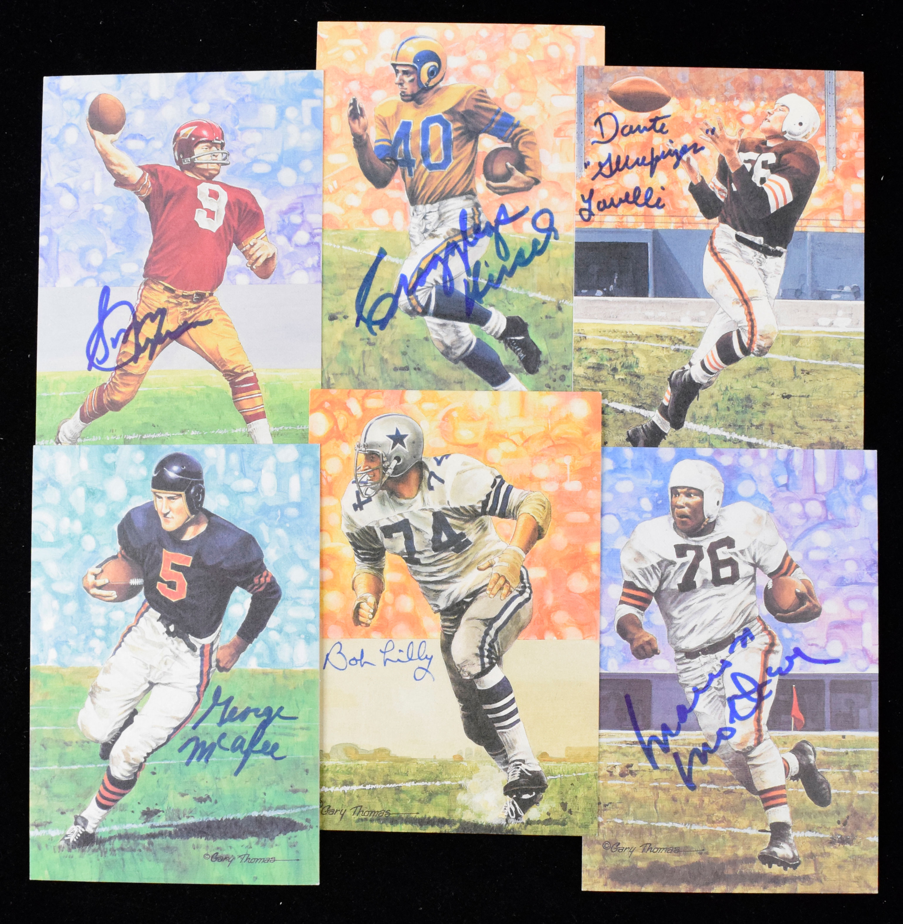 Description:Lot of (12) Football HOFers signed Goal Line Art cards (NM-NM/MT). Includes Crazylegs Hirsch, Yale Lary, Dante "Gluefingers" Lavelli, George McAfee, Gino Marchetti, Marion Motley, Bob Lilly, Sonny Jurgensen, Jim Langer, Larry Little, Tom Mack with "HOF 99" inscription, and Ron Mix. Signatures rate 8 to 10 out of 10: NM-NM/MT