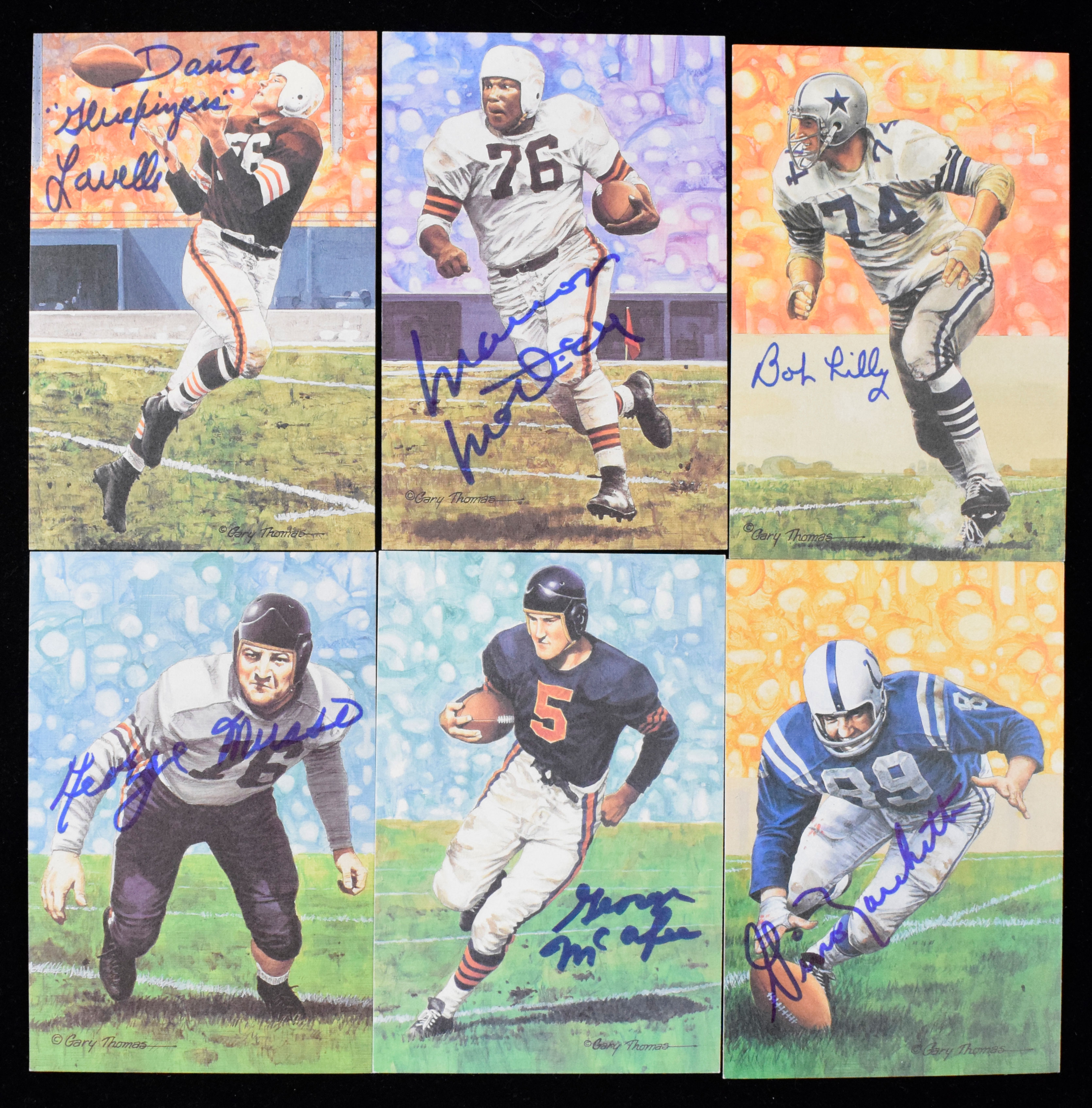 Description:Lot of (11) Football HOFers signed Goal Line Art cards (NM-NM/MT). Includes Dante "Gluefingers" Lavelli, Yale Lary, Gino Marchetti, George McAfee, Marion Motley, George Musso, Leo Nomellini, Bob Lilly, Jim Langer, Tom Mack, and Ron Mix. Signatures rate 8 to 10 out of 10: NM-NM/MT