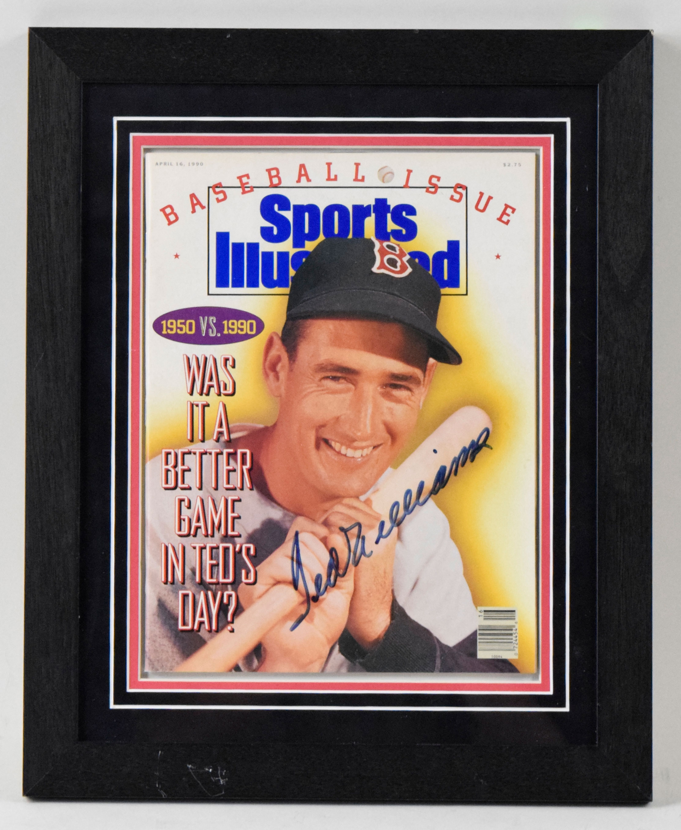 Description:Ted Williams signed 1990 Sports Illustrated - JSA (NM framed). Frame measures approx. 13"x16". April 16th issue signed by Williams in blue marker. Signature rates 9/10 out of 10. Includes LOA from JSA. Due to framing, complete condition is unknown: NM appearance