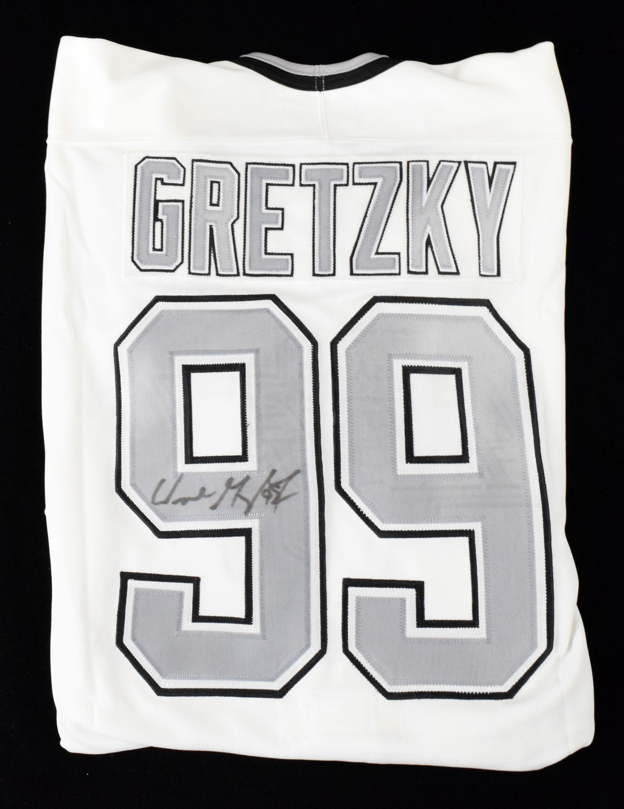 Description:Wayne Gretzky signed Los Angeles Kings jersey (NM). CCM size 54 Kings #99 Wayne Gretzky jersey signed by Gretzky in black marker. Signature rates 8 out of 10. High quality retail jersey with fight strap: NM