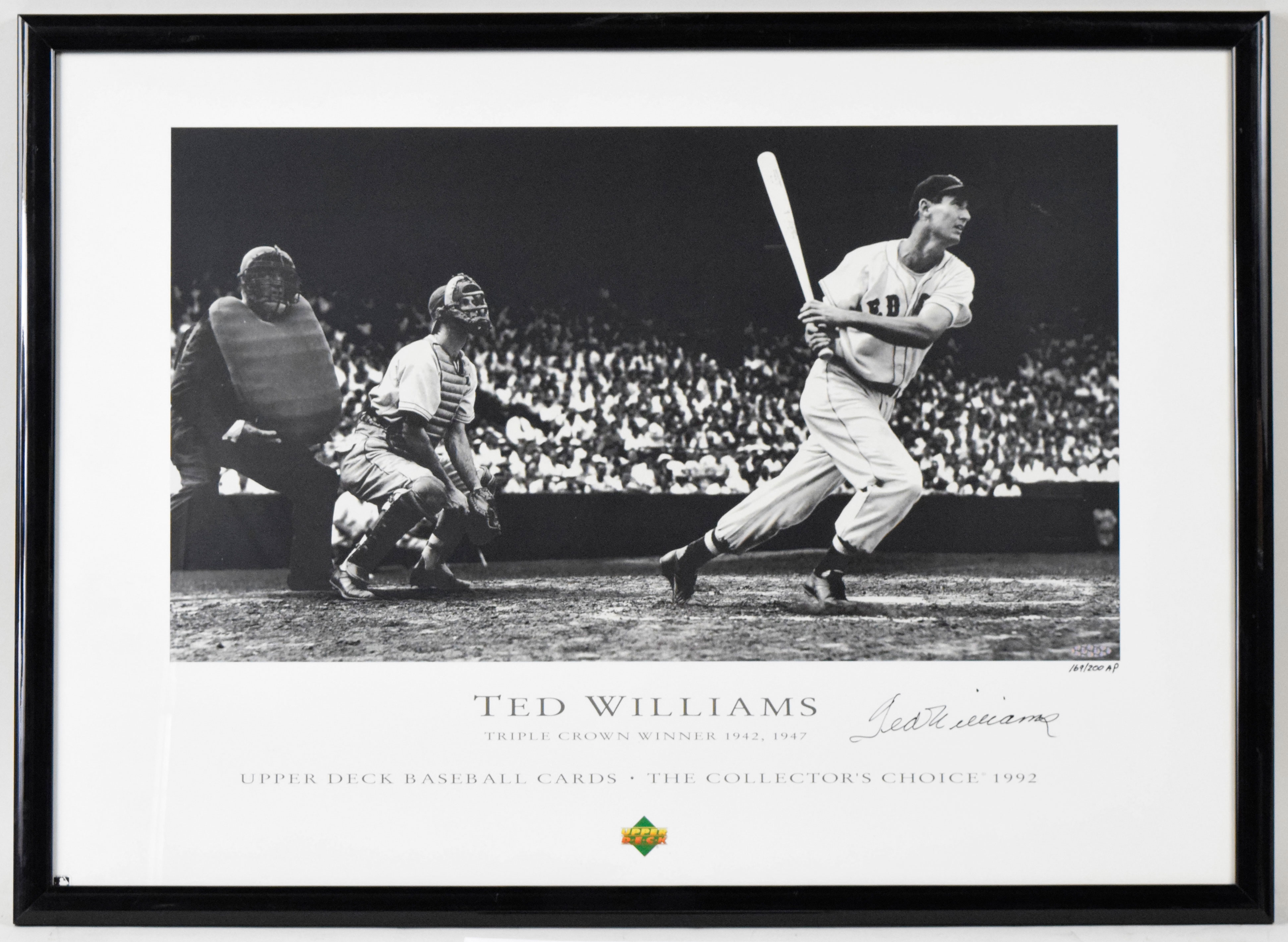 Description:Ted Williams signed limited edition framed 1992 Upper Deck promotional poster - UDA (NM). Frame measures approx. 22.5"x31". Williams signed the poster in black marker. Signature rates 9 out of 10. Numbered "169/200 AP", and Upper Deck Authenticated serial #ed hologram sticker is on the poster. Due to framing, complete condition is unknown: NM appearance