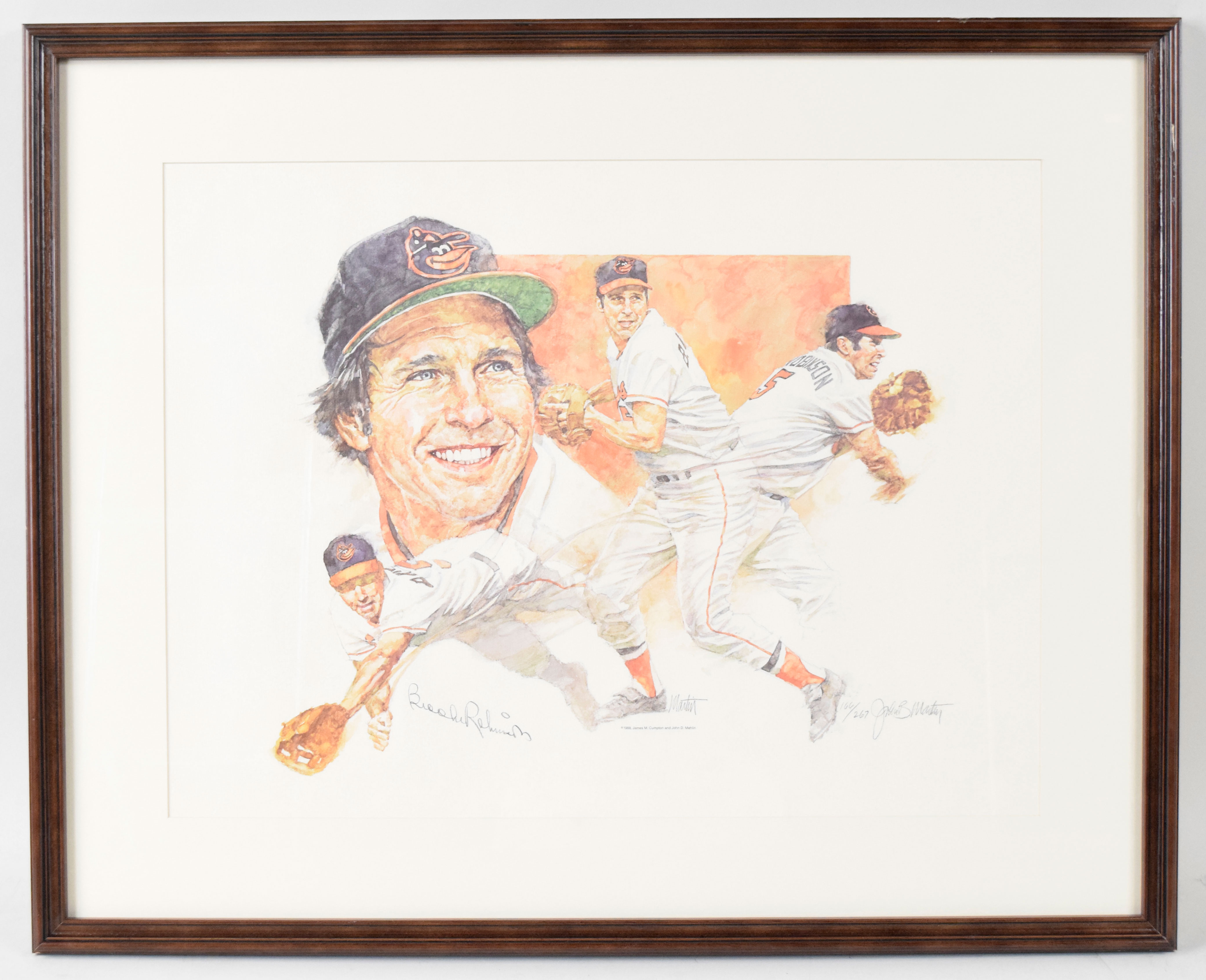 Description:Brooks Robinson signed limited edition framed lithograph also signed by artist John Martin (NM). Frame measures approx. 25.5"x31.5". Robinson signed the lithograph in pencil. Signature rates 8/9 out of 10. Also signed by John B. Martin, and #ed 166/267. Due to framing, complete condition is unknown: NM appearance