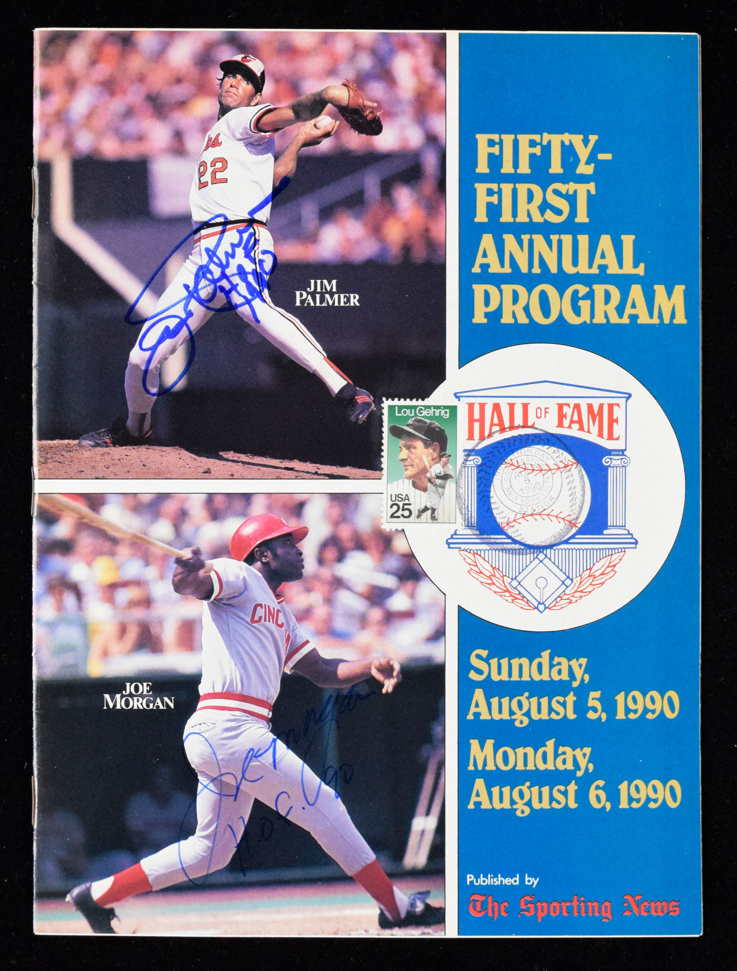 Description:Joe Morgan & Jim Palmer dual-signed & inscribed 1990 Baseball HOF Induction program (NM). Morgan and Palmer both signed the cover in blue marker with each adding their HOF 90 inscription. Signatures rate 9 to 10 out of 10: NM