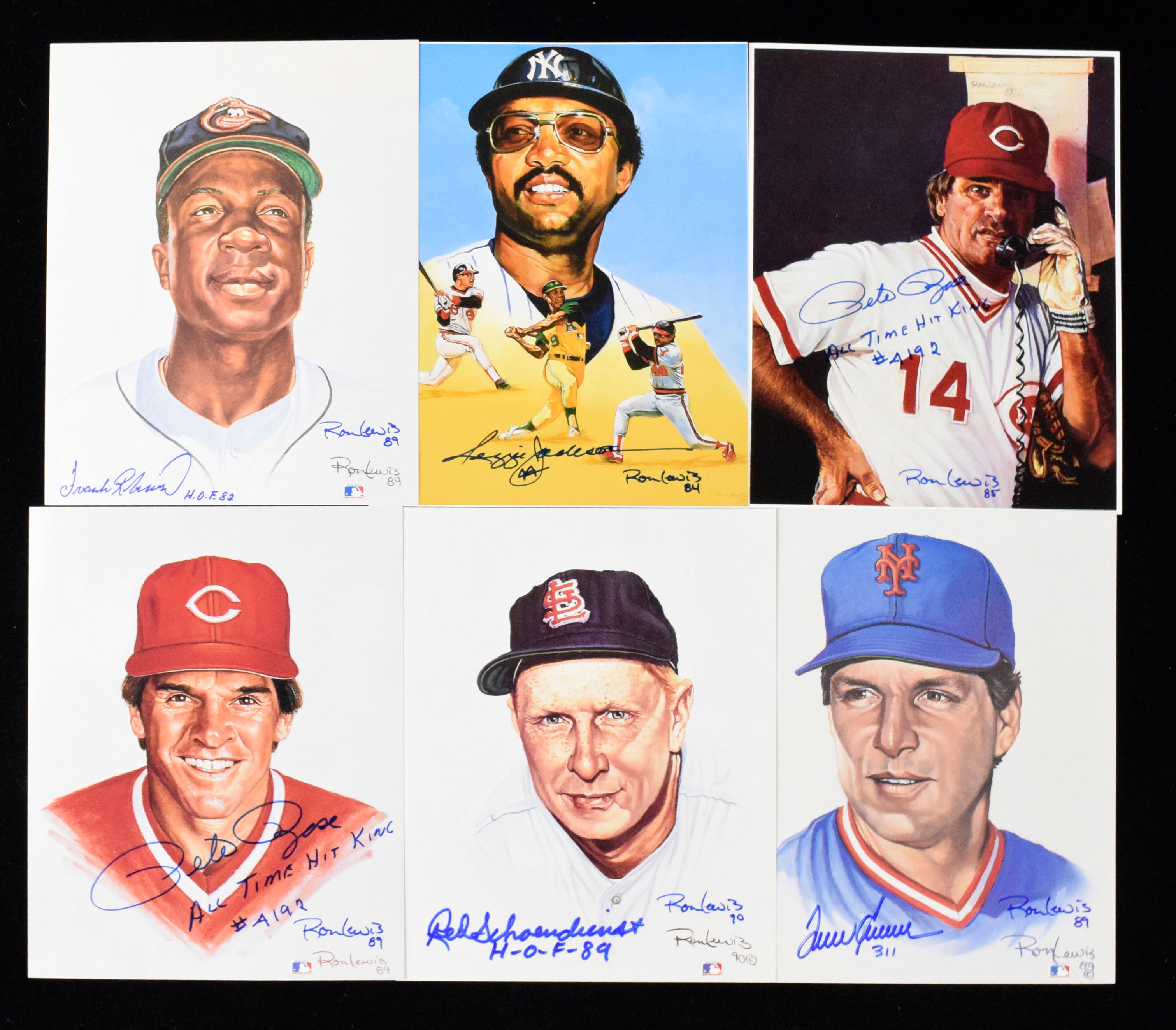 Description:Lot of (8) baseball stars & HOFers signed 8"x10" prints - most with inscriptions & also signed by artist Ron Lewis (NM-NM/MT). Includes 1984 print signed by Reggie Jackson and Ron Lewis; 1985 print signed by Pete Rose with "All Time Hit King #4192" inscription and Ron Lewis; (5) signed 1989 prints: Tom Seaver with "311" inscription and Ron Lewis, Frank Robinson with "HOF 82" inscription and Ron Lewis, Johnny Bench with "HOF 89" inscription, Reggie Jackson with "Mr. October" inscription and Ron Lewis, Pete Rose with "All Time Hit King #4192" inscription and Ron Lewis; 1990 print signed by Red Schoendienst with "HOF 89" inscription and Ron Lewis. Signatures rate 8 to 10 out of 10: NM-NM/MT
