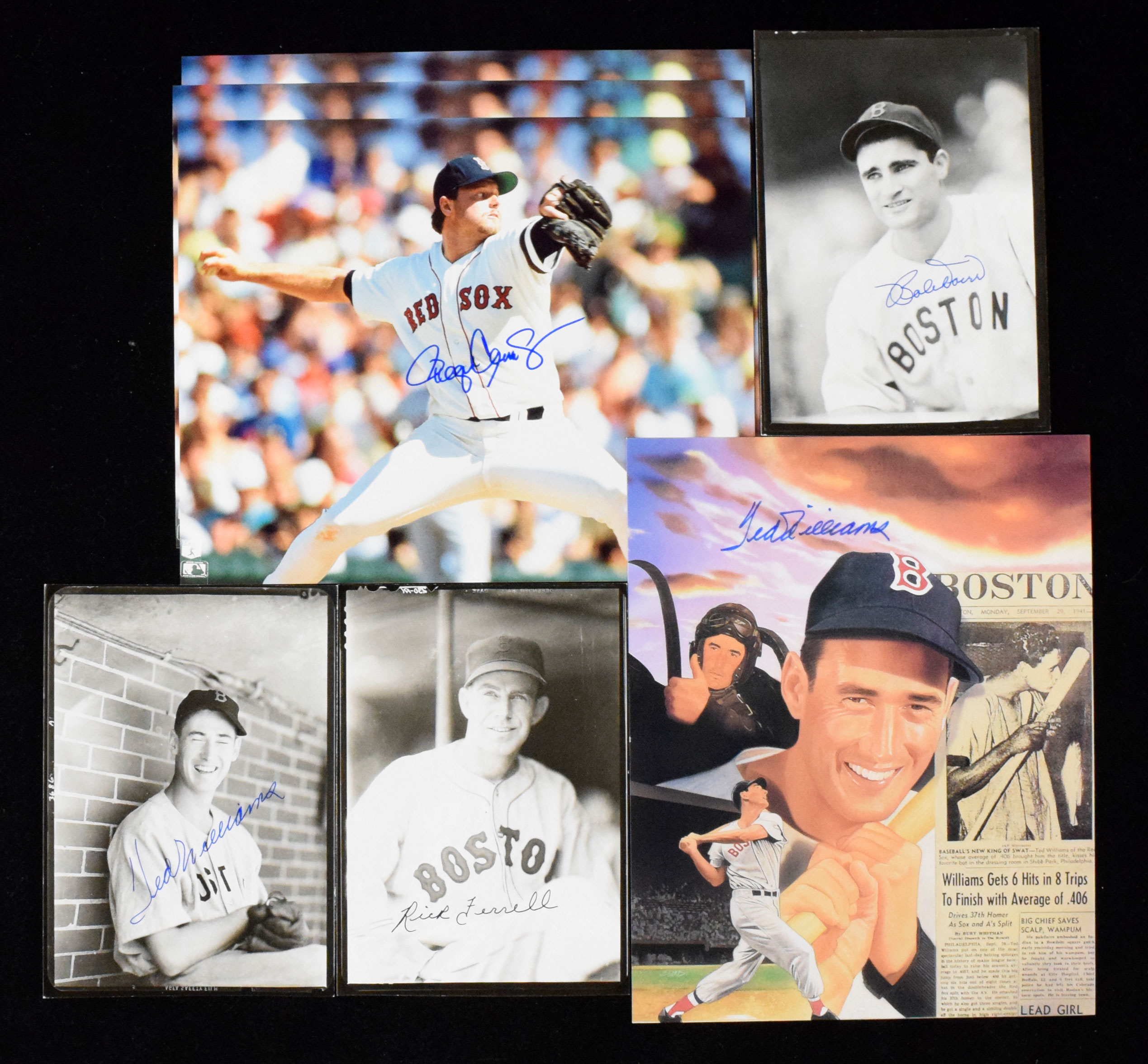 Description:Lot of (7) Boston Red Sox stars & HOFers signed photos including Ted Williams (EX/MT-NM/MT). Includes (3) signed 5"x7" photos: Ted Williams, Bob Doerr, and Rick Ferrell; 8"x10" photo signed by Ted Williams; and (3) 8"x10" photos signed by Roger Clemens. Signatures rate 8 to 10 out of 10: EX/MT-NM/MT